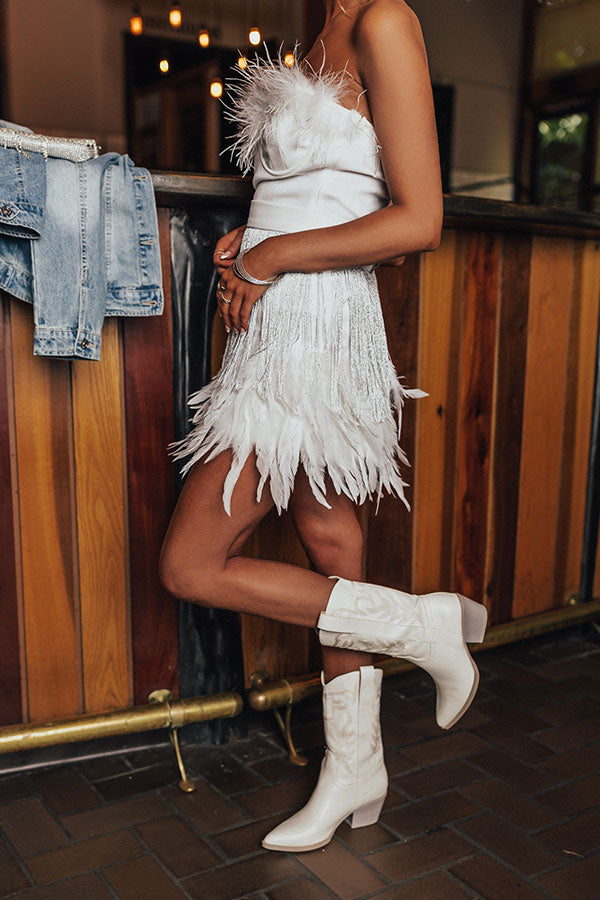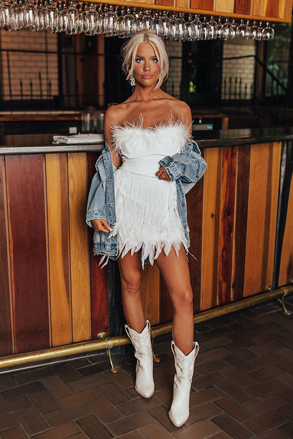 Keep your evening look groovy with this trendy ivory colored skirt featuring lightweight material with eye-catching feather detailing and shimmering fringe accents, a high waistline, and a flirty silhouette with a mid-thigh length hemline!