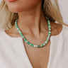 - Adorned with faceted green chalcedony and meticulously hand beaded, this stunning necklace is the perfect statement piece for any outfit. You'll definitely stand out in a crowd with this unique and eye-catching accessory.