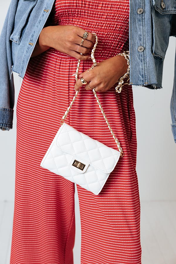 There is no better bag to effortlessly grab and go than our luxe white 'Down To The Wire' clutch featuring lightweight material with quilted texturing, a chain link shoulder strap, a flap closure with a twist clasp, and a rectangular silhouette with multiple inside compartments and pockets!