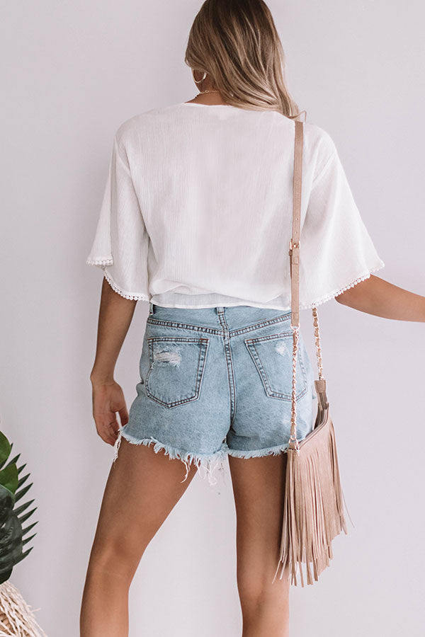 This ivory summer top features short flowy sleeves with pom pom hems, a v-neck with eyelet detail, and a knotted hem! You can style this feminine piece with distressed, high waisted shorts, leopard strappy sandals, a layered necklace, and a nude fringe bag, or you can pair it with "The Everleigh High Waist Flares in Charcoal" and "The Jess Faux Suede Heel in Grey" for some beautiful "downtown brunch" outfits! Measurements
