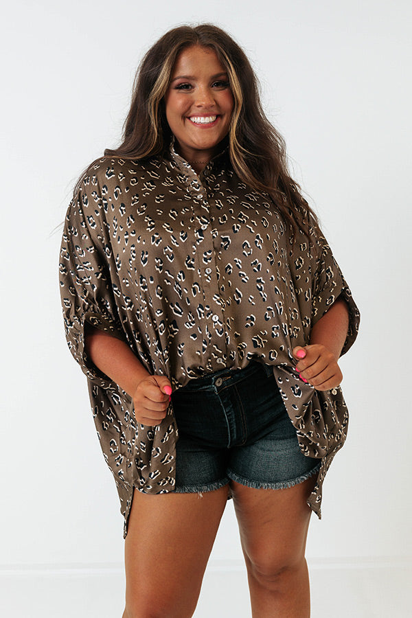 Take a walk on the wild side in our pretty martini olive colored plus size 'Dream And Dance Shift Top' featuring sleek lightweight material patterned with a black and white leopard print, a button down front with a collared v-cut neckline, oversized 3/4-length sleeves, and an oversized silhouette that falls into a rounded high/low hemline!