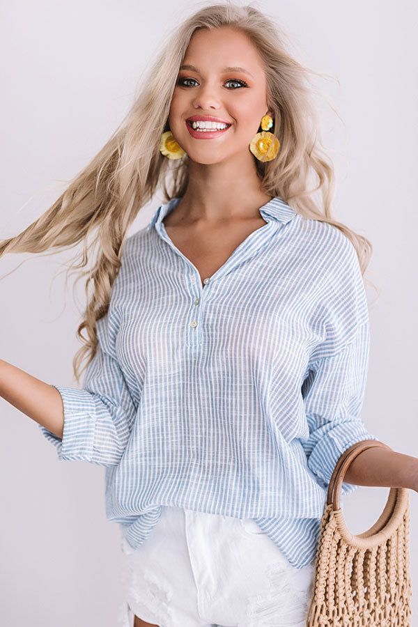 You will undoubtedly be on the style "dream team" when you wear this sky blue top featuring subtle pin stripes, a rounded hem, semi sheer fabric, a v-neck with a collar, a button up bodice, and long sleeves that an be worn down or rolled and buttoned up! We have tucked this chic piece into white distressed shorts, and accessorized with a net bag and yellow heels and earrings, but it can also be styled with "The Quincy Midrise Flares in Black" and "The Beck Espadrille Wedge in Light Natural" for an out of this world OOTD! For more coverage, we recommend wearing with a bralette or camisole underneath to achieve a perfectly layered look. Measurements