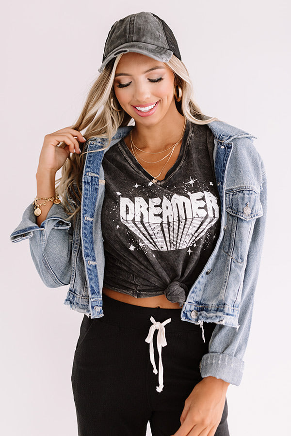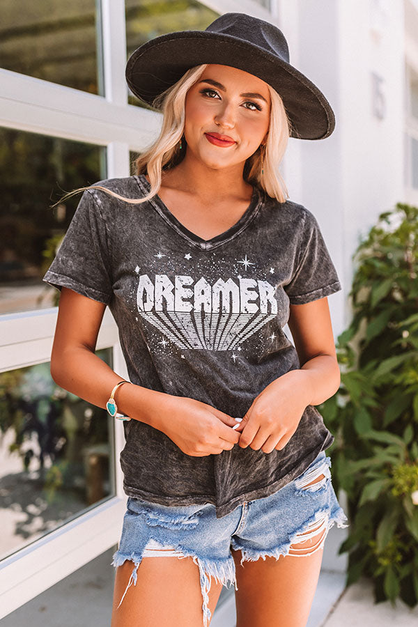 May your wildest dreams come true in this trendy black shift tee featuring soft lightweight vintage wash material with an adorable lettering and stars graphic on the front, short loose sleeves, and a relaxed silhouette that falls into a rounded hemline that can be knotted! We have layered this chic grunge piece under a overlay with some distressed denim shorts, a leopard statement belt and matching faux suede hat, and a brown bootie and tote, but you can also wear it with some frayed white skinnies and the "Mesh Slip On Sneaker!" Measurements