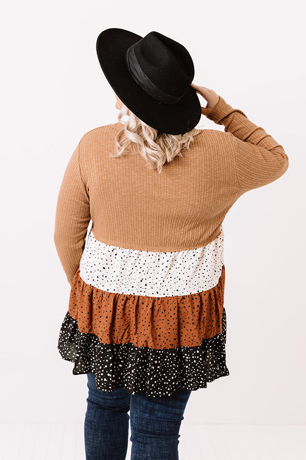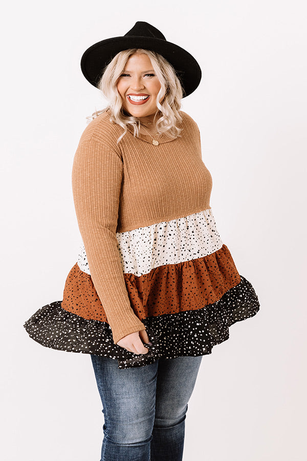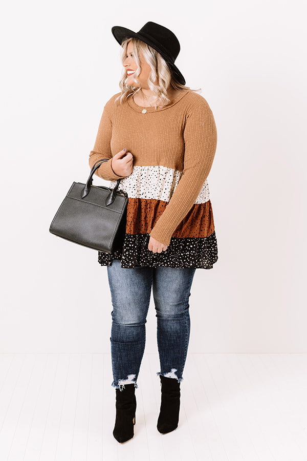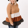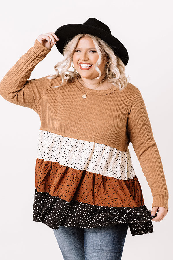 Plus Size - People will surely be dreamin' about you in this unique rust hued top long after you wear it with its lightweight tight knit bodice featuring ribbed texturing, three tiered horizontal color blocks patterned with spotted prints, a high rounded neckline, long loose sleeves, and a relaxed silhouette that falls into an uneven hemline! Measurements