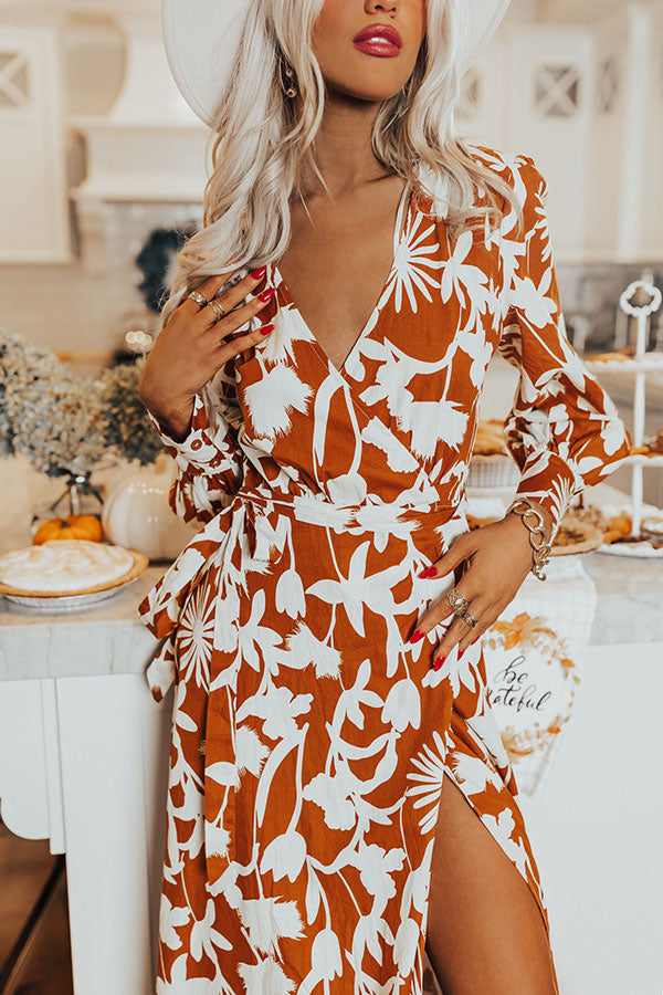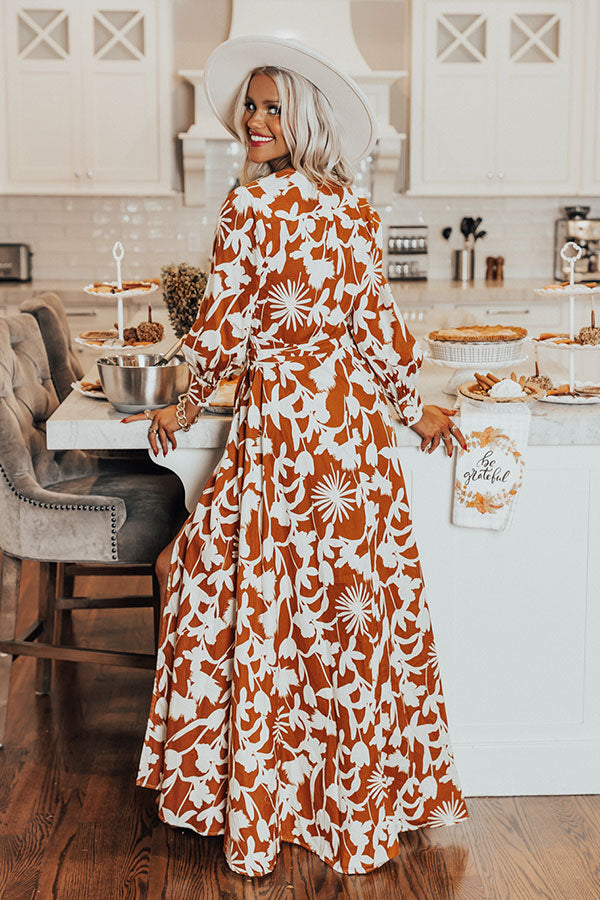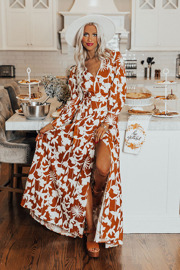 Look as stunning as ever in this rich, rust hued maxi patterned with cream floral prints. Features a side tie closure, v-cut neckline, long sleeves with button closure cuffs and a flattering silhouette that cascades into a floor length hemline!
