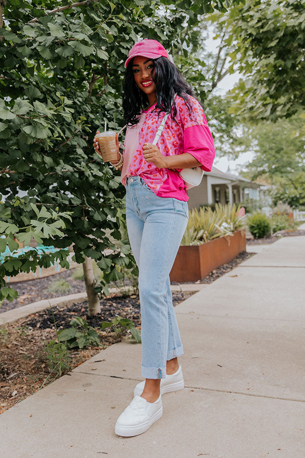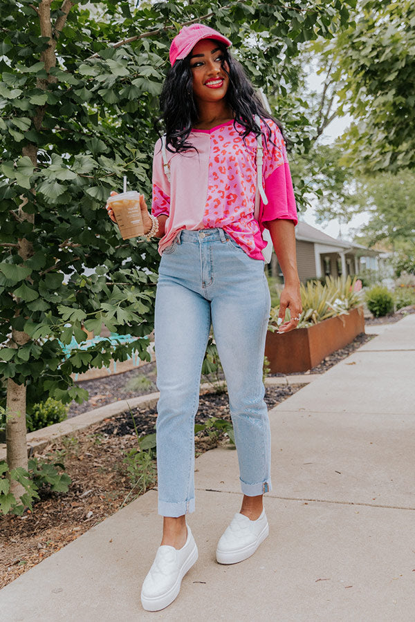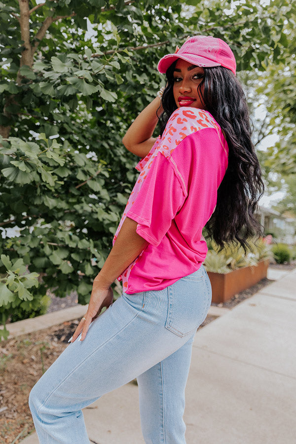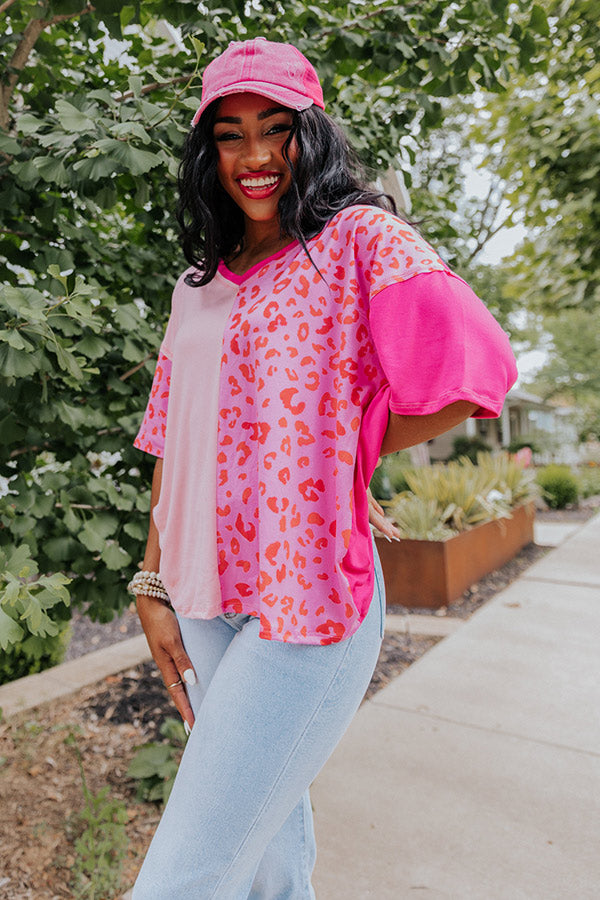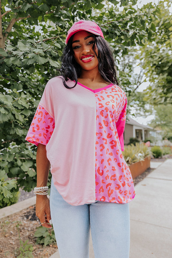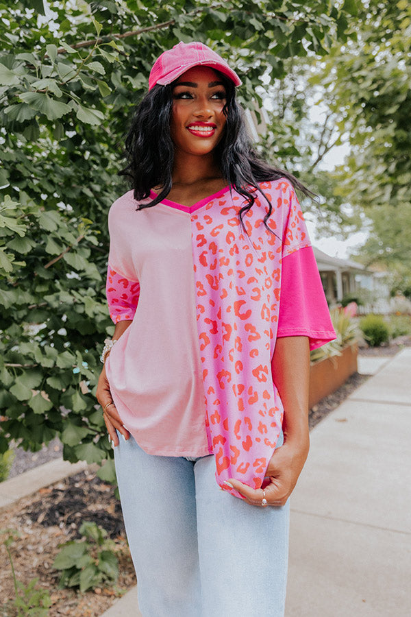 Dream big in this comfy but cute shift top featuring soft lightweight and flowy material patterned with pink leopard print accents and color block panels, a v-cut neckline, short loose sleeves, and an ultra slouched silhouette that ends in a straight hemline! Measurements