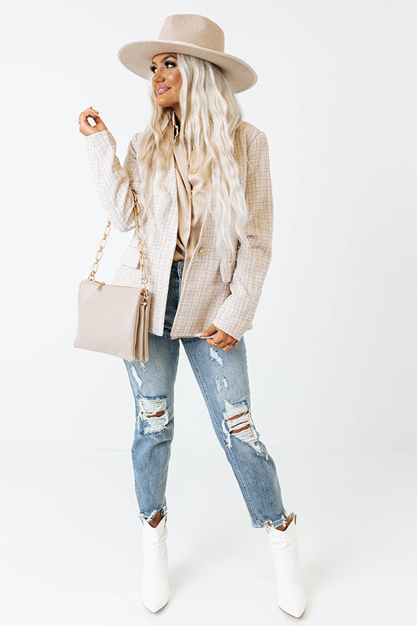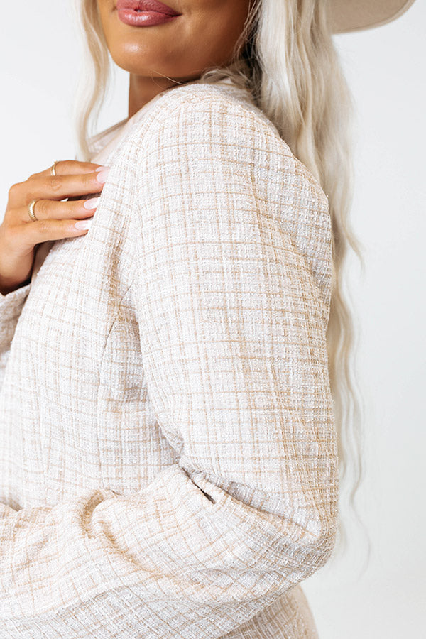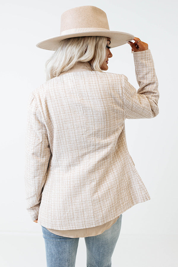 Take your girl boss wardrobe to the next level with our birch colored designer inspired 'Dreaming Bigger' blazer featuring luxe tweed material, long sleeves, low accent pockets with flap closures, and a flattering silhouette that ends in a straight hemline!