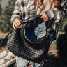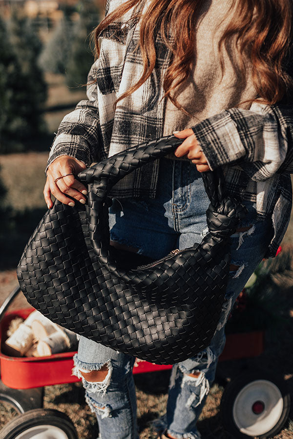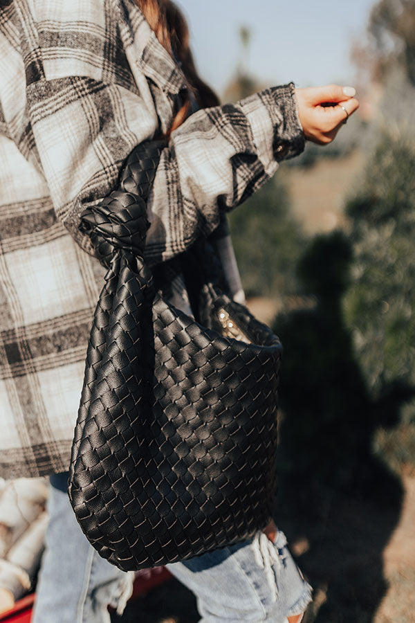 Treat yourself to our darling black 'Dreaming Of Sonoma' tote featuring sleek woven material, a single tote handle with a large knot accent, and a spacious lightweight pouch with a zip closure and additional inside pockets!