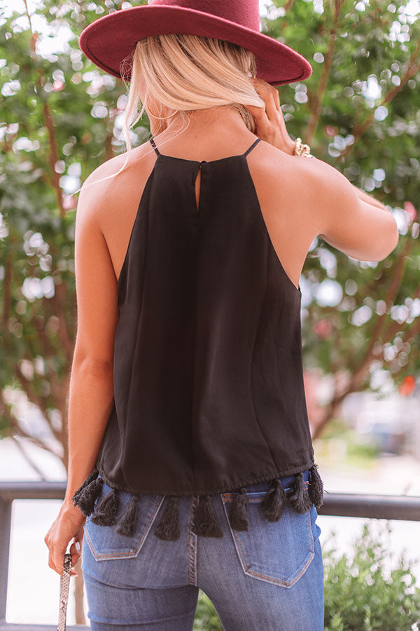Dress to impress in the "Dreaming Of Vail" black tank featuring a high rounded neckline with spaghetti straps, a loose straight silhouette with a tasseled hemline, and a keyhole accented upper back with a button closure! Your styling options are endless with this upscale basic, whether you style it with some denim flares, platform heels, a snake print crossbody, and a maroon faux suede hat, or with some frayed white shorts, "The Millie Striped Wedge," and our "Glam Goal Earrings in Black" for multiple outfits that will take your from the summer breeze to autumn leaves!
