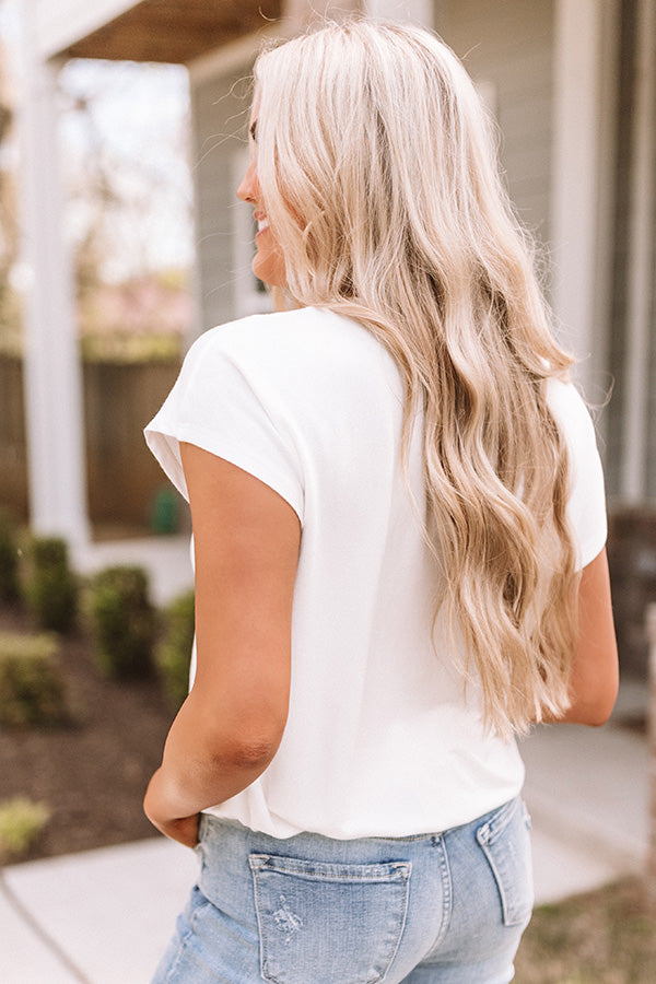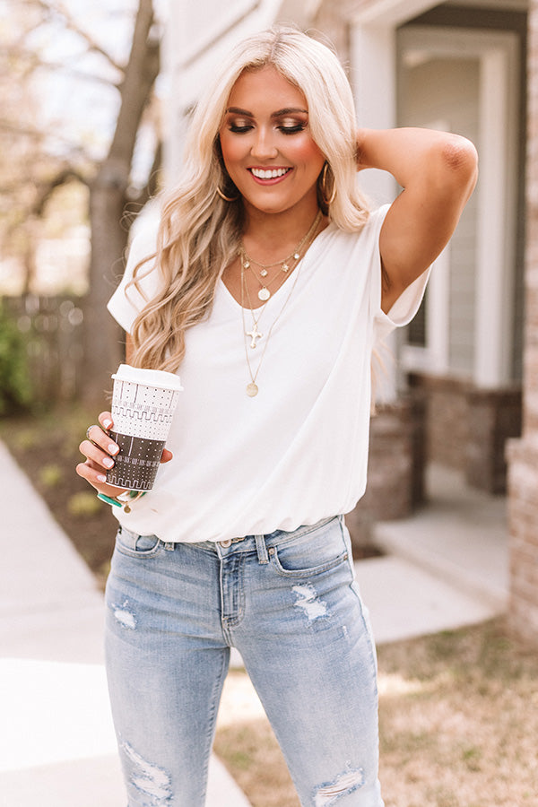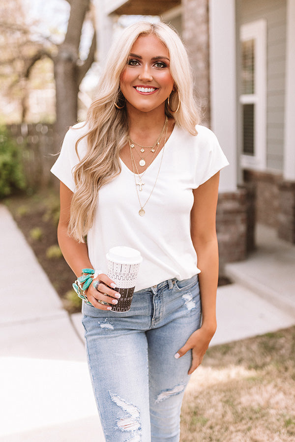 Your style options are endless with our trendy but casual white "Dreaming Until Dawn Top" featuring soft lightweight material, a v-cut neckline, short loose sleeves, and a relaxed silhouette that falls into a straight smocked hemline! You can pair this versatile piece with some distressed ankle skinnies and a brown espadrille, but you can also wear it layered under a cropped jean jacket with some frayed black shorts, our black and white "Rory Sandal," sunnies, and our black and white stripe "Keep It Beachy Canvas Tote!" Measurements