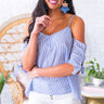 From Park Ave. to a picnic in the park, this seersucker sweetie has got you covered! This blue & white striped seersucker top has thin adjustable straps that support a cold-shoulder sleeve with feminine cuffs that tie, & has a breezy shift bodice that you are sure to love.