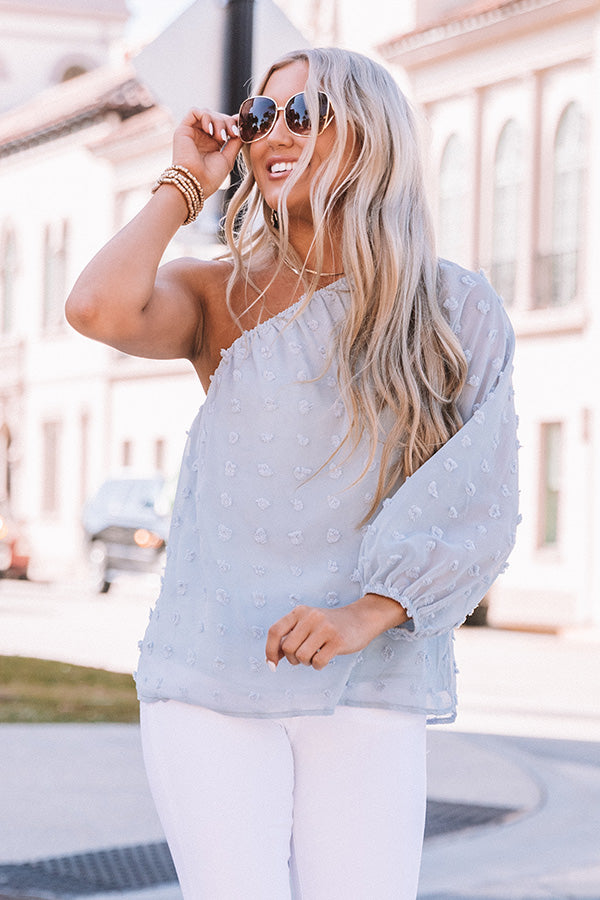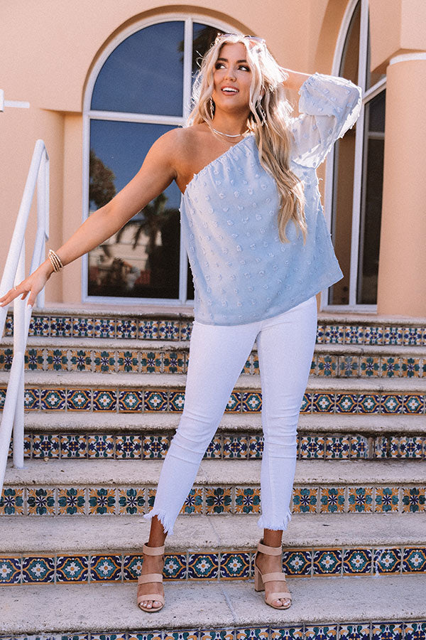 May all your dreams come true in this darling airy blue top featuring lightweight flowy material with knit polka dot texturing, a diagonal neckline and upper back with a single left bubble sleeve, and a relaxed but flattering silhouette that falls into a straight hemline!