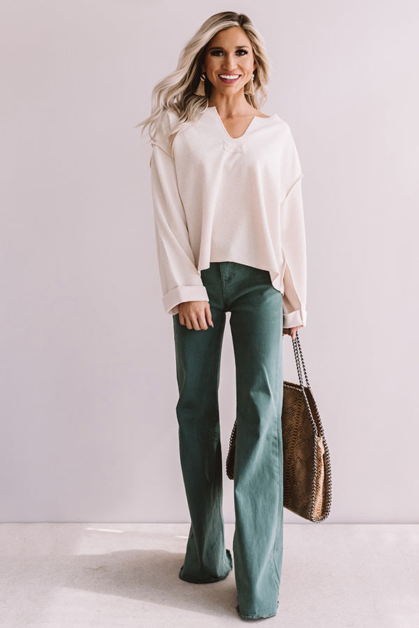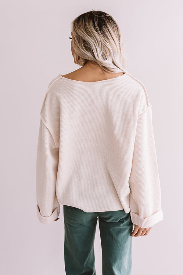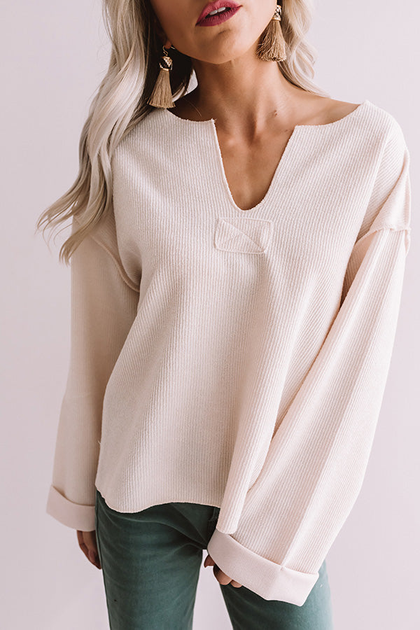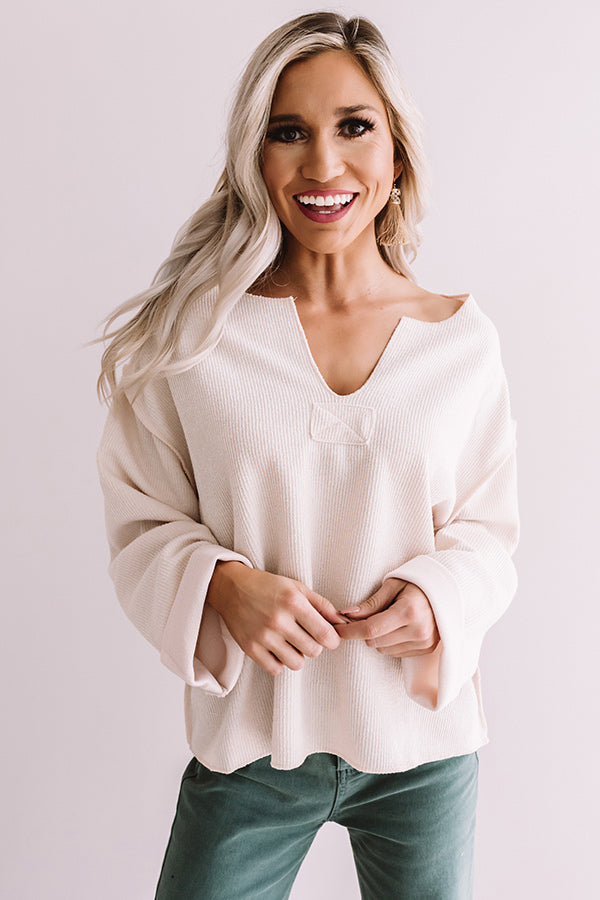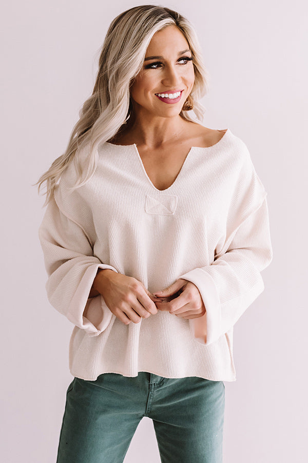 Cozy up for fall in the cream colored "Dreams Of Snow" shift top featuring soft lightweight tight knit material with ribbed texturing, a rounded neckline with a scooped v-neck cutout, long oversized sleeves with rolled cuffs, exposed accent seams, and a relaxed silhouette that falls into a straight hemline! Measurements