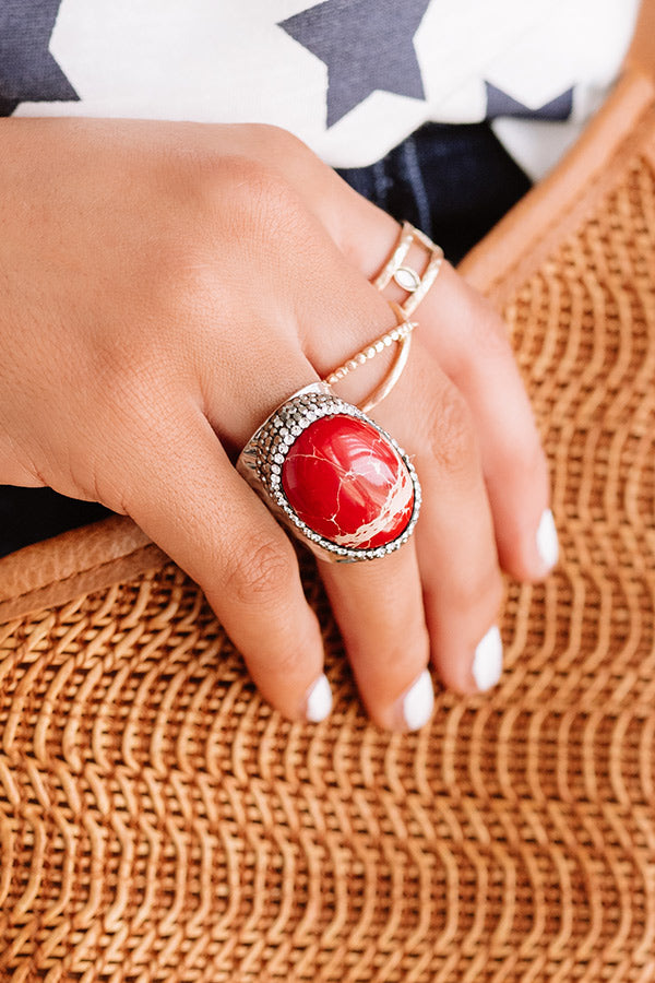 This stunning statement ring is dreamy and darling with its beautiful deep red faux stone surrounded by clear rhinestones and set on a wide textured silver band!
