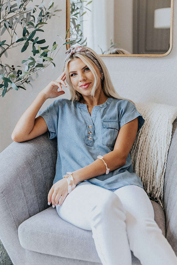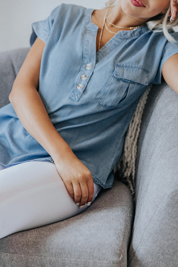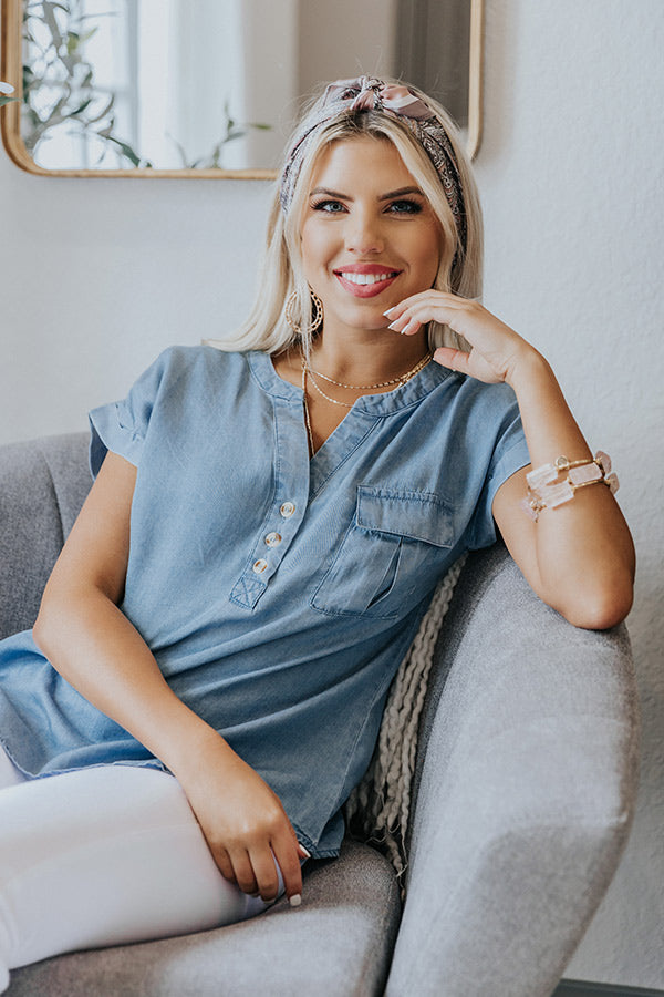 Your look is sure to look dreamy when you wear this darling top featuring lightweight and flowy light wash chambray material, a three button up bodice with a rounded neckline, a single accent chest pocket, short sleeves with rolled cuffs, and a relaxed silhouette that falls into a rounded hemline! Measurements