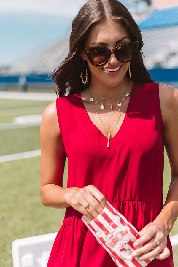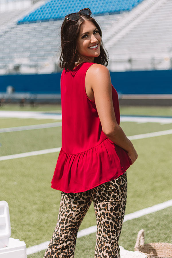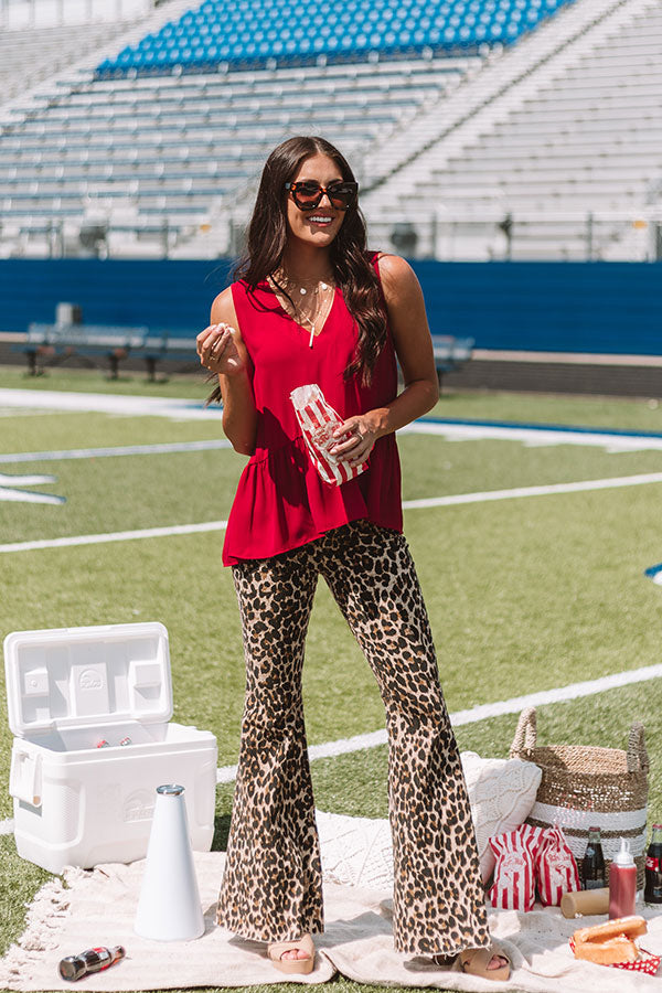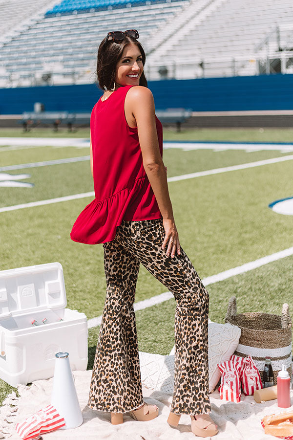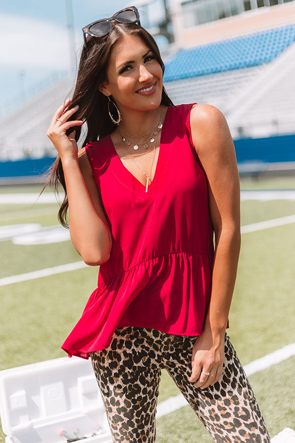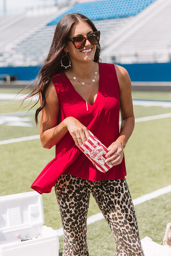 This wine shift tank is ideal for wearing on those dreamy days when you are tailgating and cheering on your favorite football team! With its v-neck, wide straps, loose bodice, and peplum bottom, it styles perfectly with some leopard flares, a transparent crossbody, and a neutral platform heel! Measurements