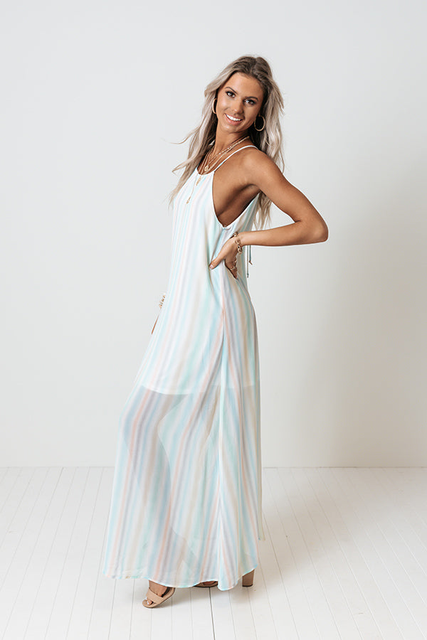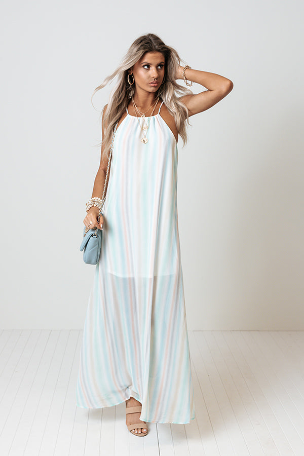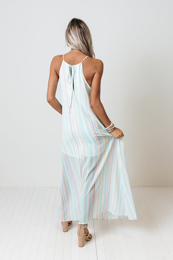 You are sure to have a dreamy day when you wear this summer maxi dress featuring lightweight breezy material patterned with subtle mint, blue, and light pink hued vertical accent stripes, spaghetti straps that thread through the front neckline and tie in the v-cut back, and an ultra relaxed silhouette that cascades into a straight ankle-length hemline! PLUS, it has a sewn in slip!