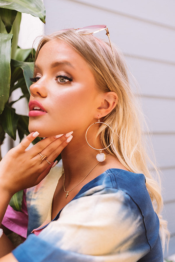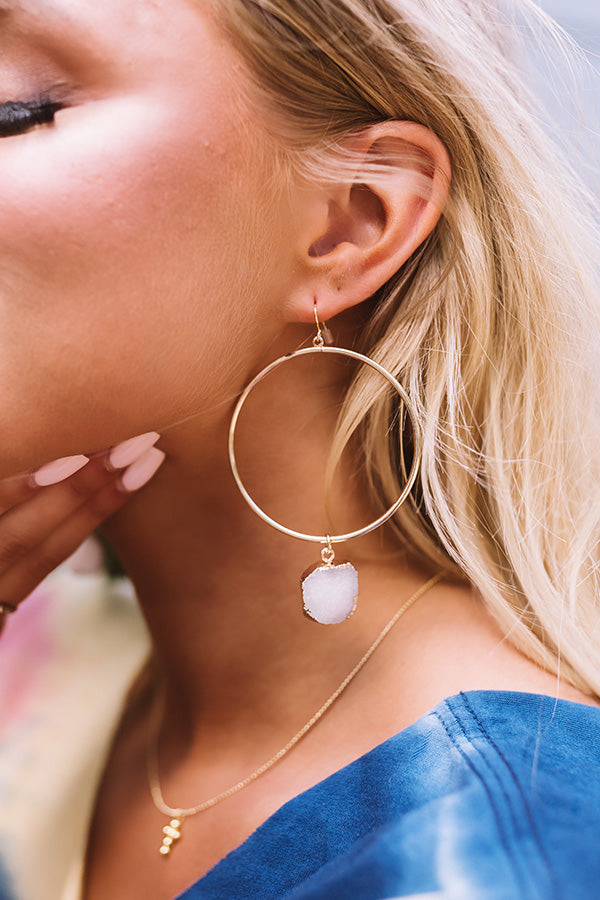 You are sure to LOVE these dreamy statement earrings featuring large dangling dainty gold hoops with white druzy stone charms!