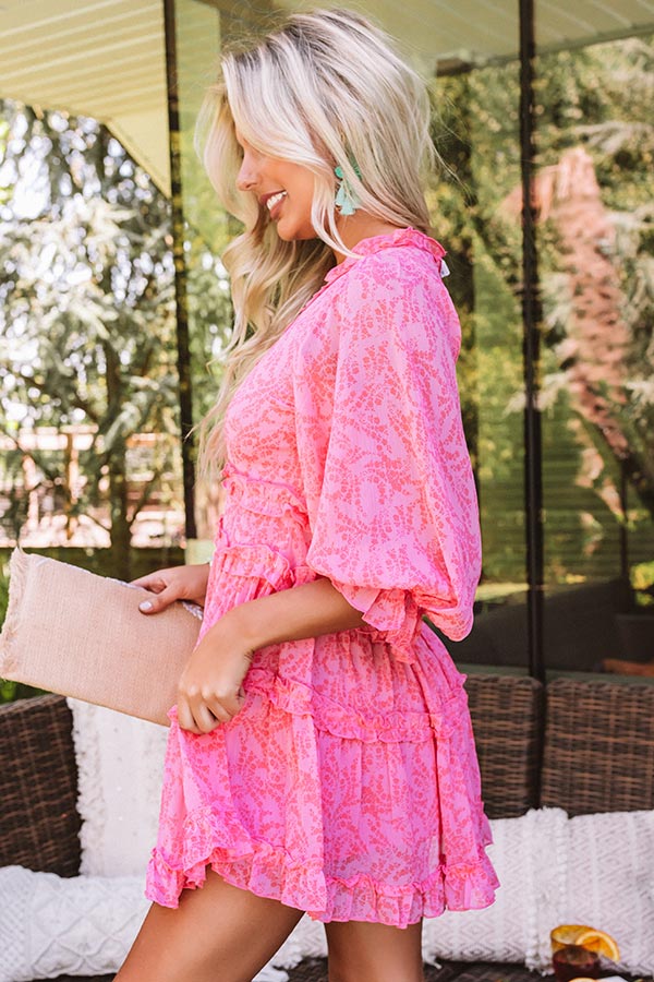 Everyone's gaze is sure to fall on you when you wear this dreamy pink dress featuring lightweight breezy material patterned with a subtle darker floral print, a deep v-cut neckline, exposed ruffled accent seams, half bubble sleeves with fitted elastic banded cuffs, a smocked waistline, an cutout back with a button closure, and a relaxed tiered skirt silhouette that falls into an uneven mid-thigh length hemline! We have styled this gorgeous piece with a woven block heel and embellished clutch, but you can also wear it with our matching pink "Kai Wedge" and our "Under The Italian Sun Hat in Tan!" Measurements