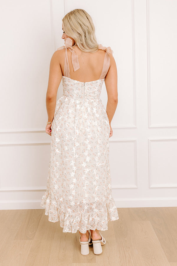 - Go on a sunlit stroll in this dreamy midi! Featuring playful tied straps and a floral design, this effortless piece is perfect for brunch, weekend outings, or seasonal photo sessions. - Fully lined material with a floral print featuring sage and orange hues as well as an ivory colored velvet floral design - A sweetheart neckline - Built-in bust padding - Organza straps that tie into bows at the tops of the shoulders - Back zip closure - A flowy silhouette that ends in a ruffled midi length hemline