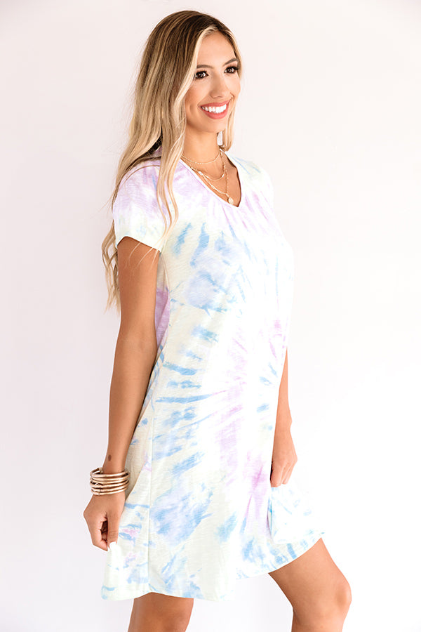 You will be "dressed like a daydream" when you wear this trendy dress featuring soft lightweight material patterned with lavender, blue, and yellow hued tie dye, a v-cut neckline, short loose sleeves, and a relaxed silhouette that falls into a straight mid-thigh length hemline! We have styled this cutie with a neutral wedge and faux leather tote, but you can also wear it with "The Lula Heel in Lavender" and our "Laying Out In Laguna Woven Hat!"