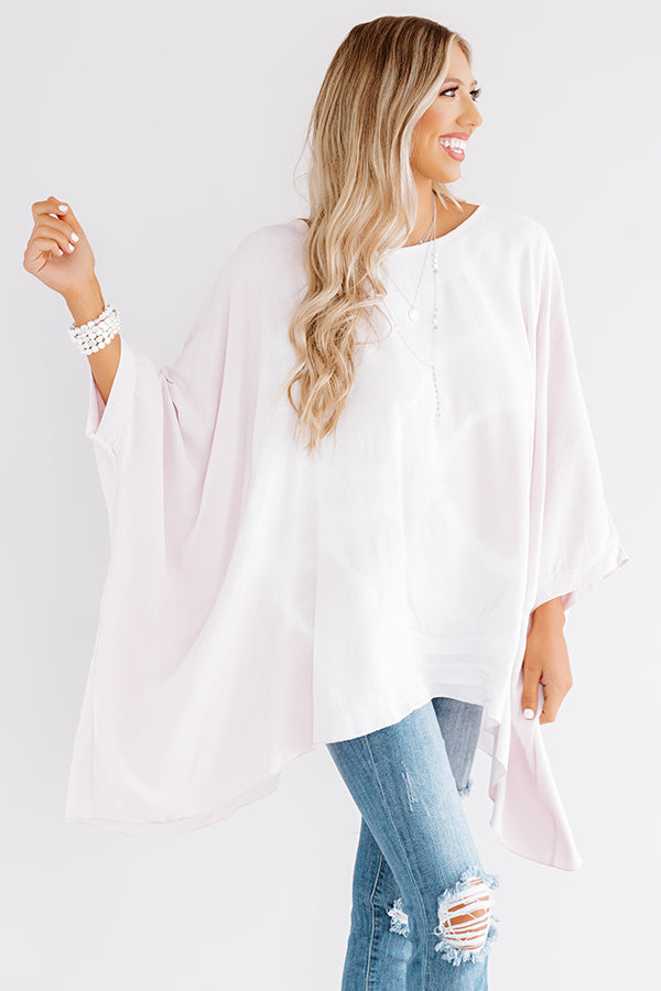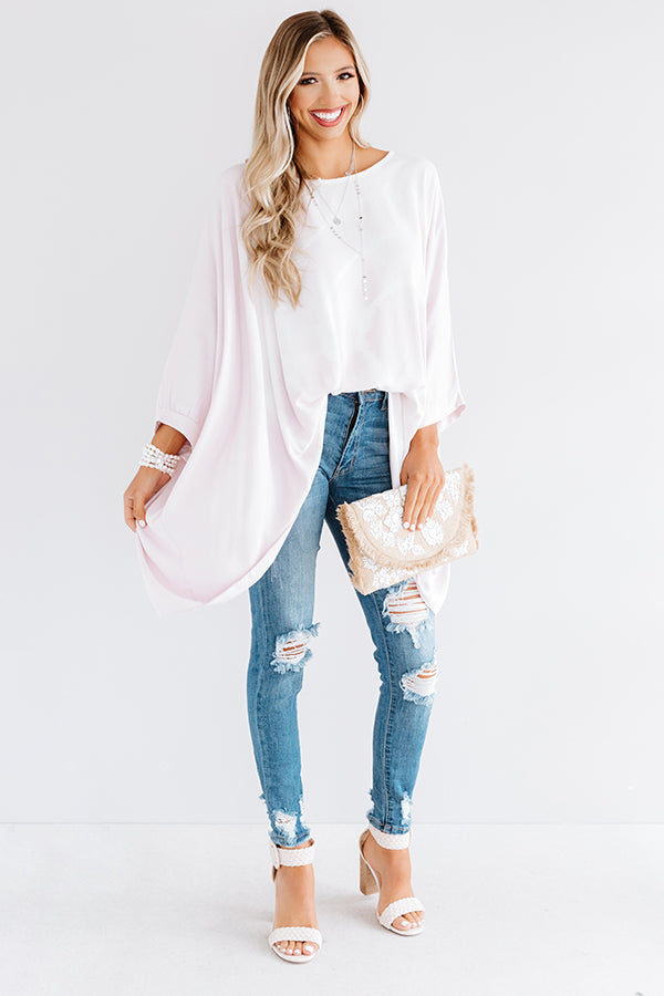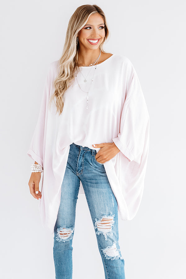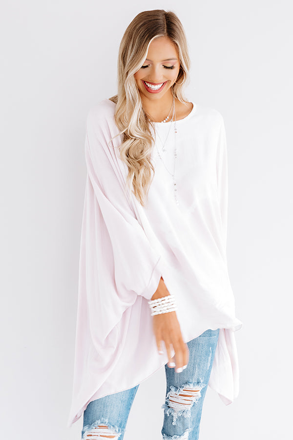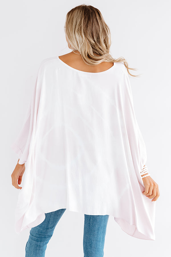 Upgrade your year round style with our effortless light pink "Drift Away" shift tunic featuring lightweight breezy material patterned with white tie dye, a high and wide rounded hemline, long oversized bubble sleeves, and an ultra relaxed draped silhouette that falls into an uneven mid-thigh length hemline! We have front tucked this adorable transitional piece into some distressed medium wash skinnies, white heels, and an embellished clutch, but you can also wear it with some frayed white shorts, our matching light pink "Kort Heel," and our matching "See You Soon Wool Hat!" Measurements