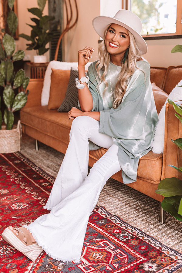 Upgrade your year round style with our effortless sage colored "Drift Away" shift tunic featuring lightweight breezy material patterned with white tie dye, a high and wide rounded hemline, long oversized bubble sleeves, and an ultra relaxed draped silhouette that falls into an uneven mid-thigh length hemline! We have front tucked this adorable transitional piece into some white flares, brown block heels, and a matching statement bracelet and wool hat, but you can also wear it with some distressed denim shorts, "The Alba Wedge in Ivory," and our "Golden Coast Woven Crossbody in Ivory!" Measurements
