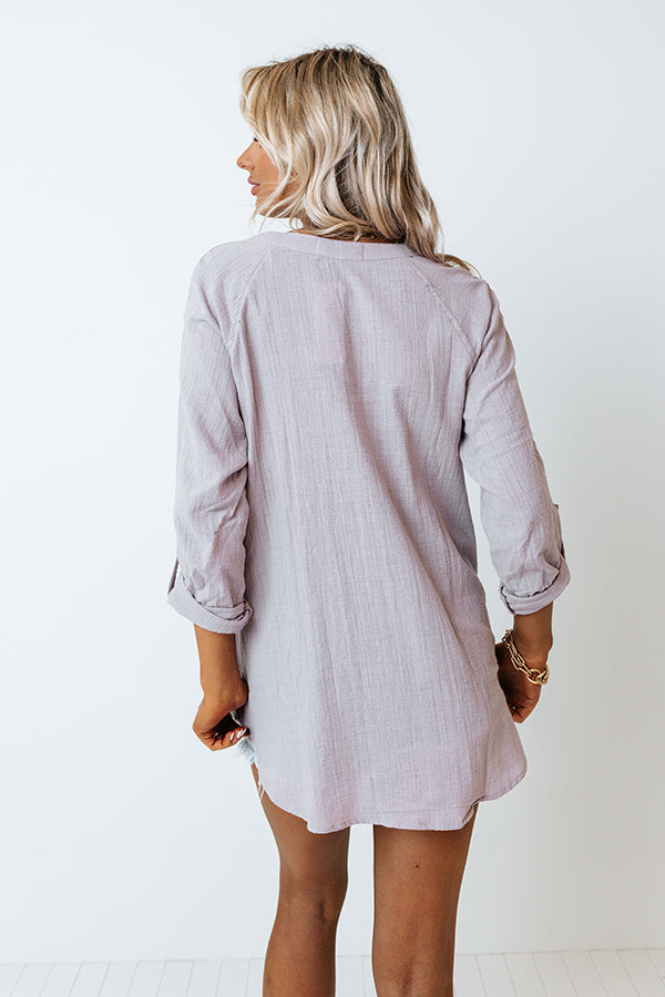 Keep casual but cute in our simple dusty purple colored 'Drifting Out To Sea Tunic' featuring thick yet lightweight linen-like material, a button down front, low accent side pockets, long loose sleeves with roll-tab cuffs, and a relaxed silhouette that falls into a rounded hemline! on products