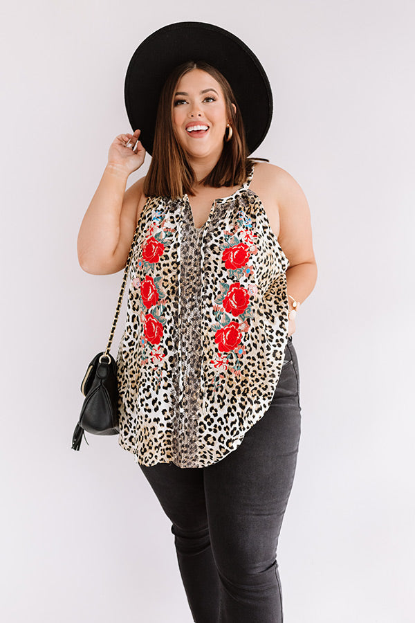 Plus Size - This unique shift top is sure to drive your style wild with its lightweight material, black and neutral hued leopard print with intricate floral embroidery, a v-cut neckline with a tie-closure, 1-inch sleeveless shoulder straps with a racerback fit, and a relaxed silhouette that falls into a straight hemline! We have styled this cutie with some black jeans, neutral heels, and a black crossbody and faux suede hat, but you can also wear it with some frayed light wash shorts and "The Lyla Sandal in Red!" Measurements