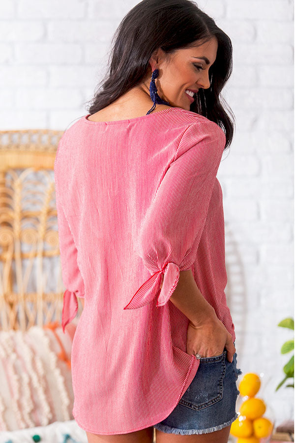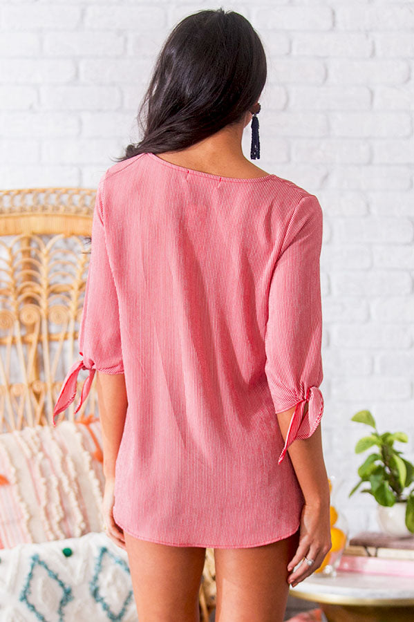 Everyone will be "dropping you a line" wanting to know where you got this classic cutie! This striped sweetie has a v-cut neckline, quarter-length sleeves that tie at the cuff & a relaxed poly bodice with a high-low bottom hem. Style this chic shift top with white skinnies for a polished look that can take you from work... Straight into the weekend!