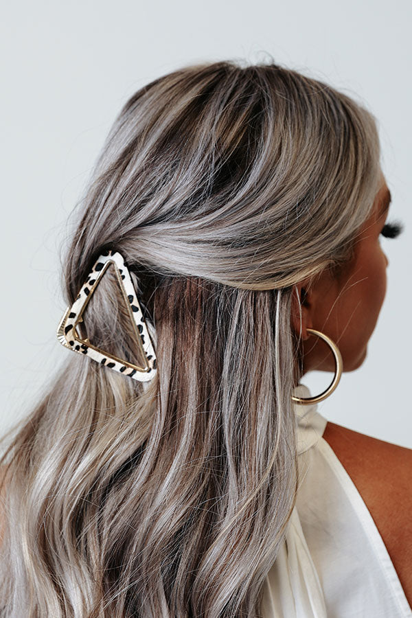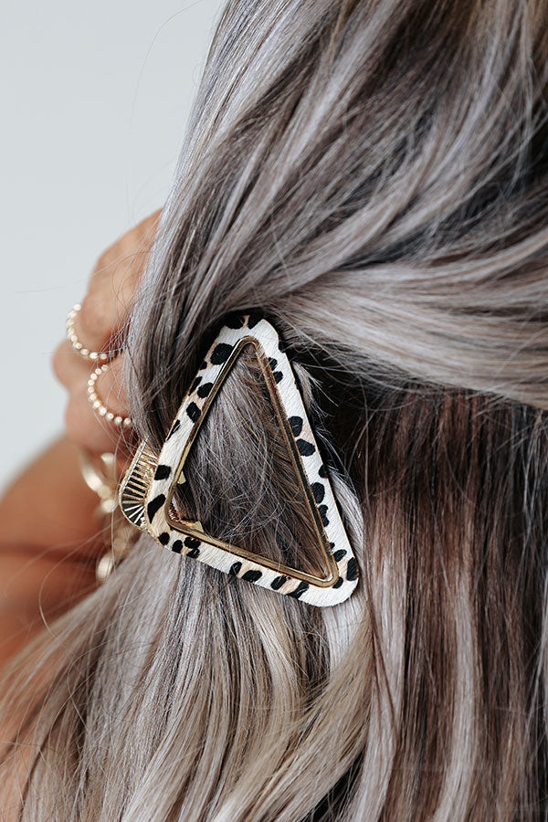 Your hairstyle will be worthy of a mic drop when you clip it up with this adorable hair claw featuring a white open triangle silhouette patterned with a black leopard print!