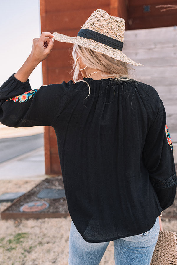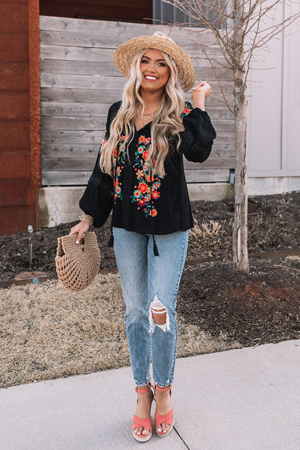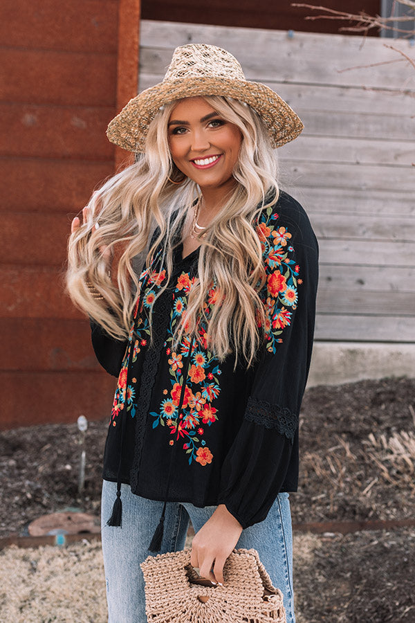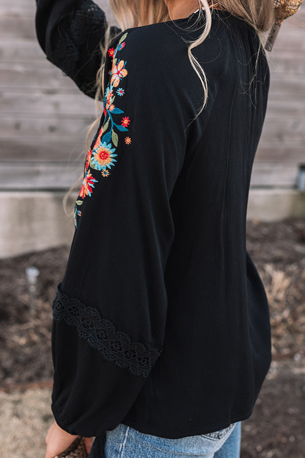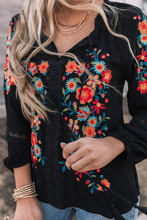 Dress for spring in our darling black 'Dune Dreaming' top featuring lightweight material with gorgeous blue, green, and red/orange hued embroidered floral detailing, a v-cut neckline with a tie closure, long loose sleeves with elastic band cuffs, and a relaxed silhouette that falls into a straight hemline!