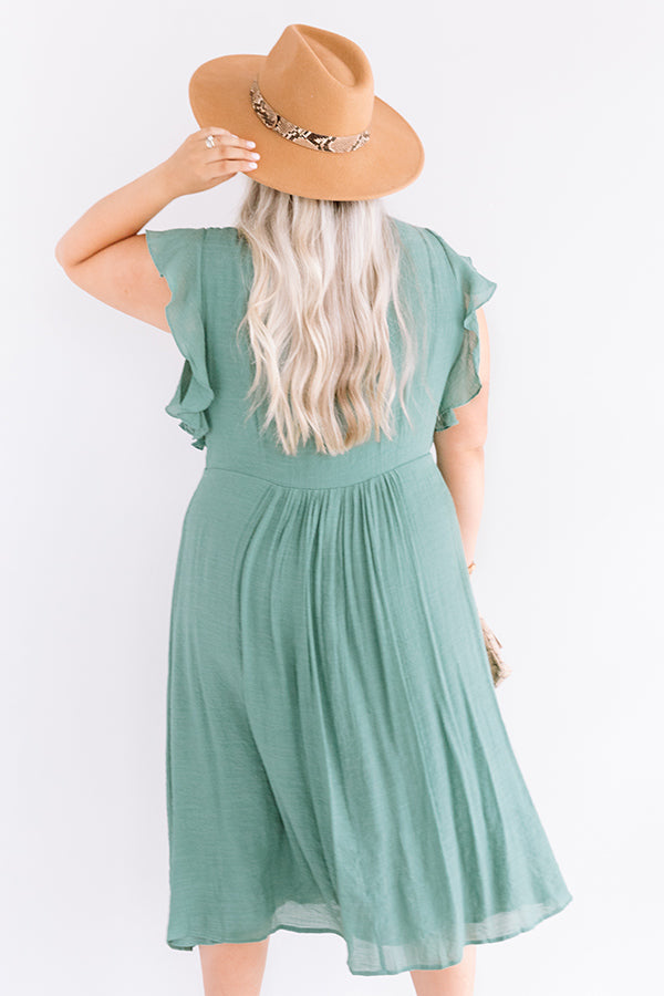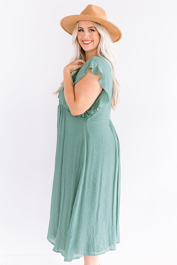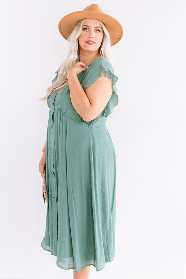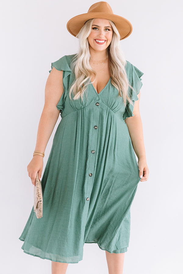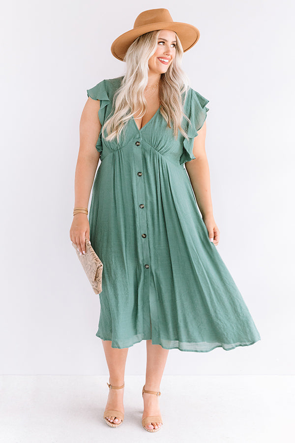 Plus Size - Everyone is sure to swoon over you when you wear this adorable dark limpet shell colored midi featuring lightweight breezy material, a button down front with a deep v-cut neckline, ruffled cap sleeves, and an ultra relaxed skirt silhouette that falls into a rounded mid-calf length hemline! We have styled this beautiful piece with a brown heel and a snake print clutch and matching faux suede hat, but you can also wear it layered under a jean jacket with "The Portia Faux Leather Peep Toe Bootie in Stone!" Measurements