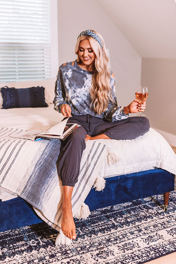 Wake up in style with our trendy "Early Mornings" top featuring soft lightweight material with a dark grey/blue tie dye, a high rounded neckline, long bubble sleeves with shoulder cutouts, and a relaxed silhouette that falls into a straight hemline! We have styled this cutie with some matching joggers and a accent headband, but you can also wear it with some distressed white shorts, "The Lela Espadrille in White," and our "Right On Cue Fringe Crossbody in White!" Measurements