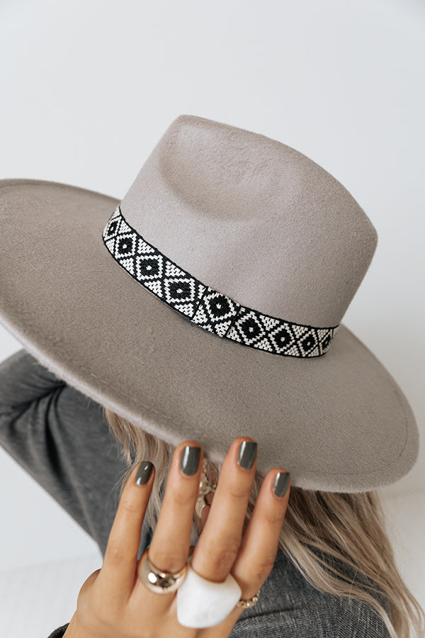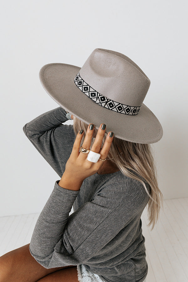 Top off your look in style with our grey 'Easily Empowered' fedora featuring lightweight felt material, a 4-inch brim, and a black diamond patterned accent band!