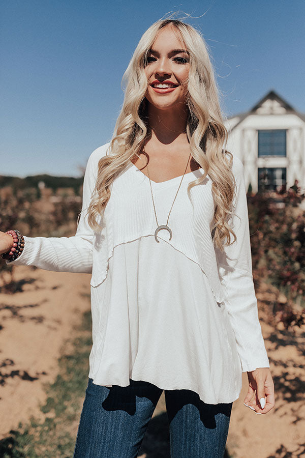 Transitional to fall in style with our white "East Avenue" top featuring lightweight material with subtle texturing, a wide v-cut neckline that can be worn off both shoulder, long loose sleeves, an exposed raw but bodice seam, and a relaxed babydoll silhouette that falls into a rounded hemline! We have styled this simple but significant piece with some dark wash flares, but you can also wear it under our "Snow In Central Park Knit Leopard Cardigan in Mocha" with "The Valerie Skirt," a black faux suede hat and tote, and "The Alice Faux Suede Thigh High Boot in Brown!" Measurements
