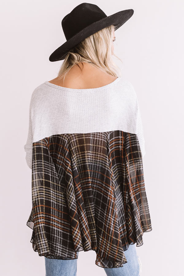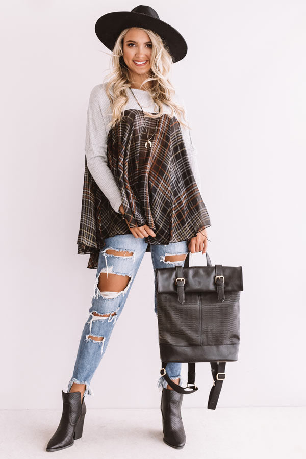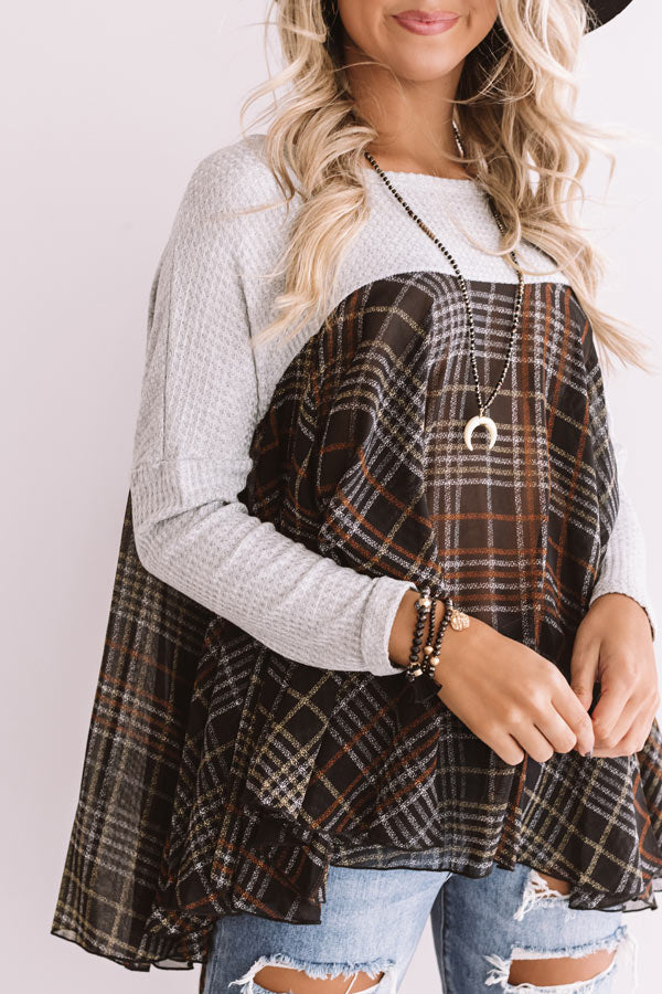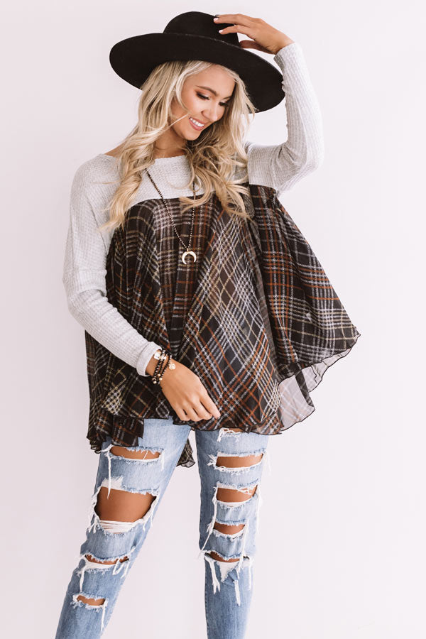 You will appear to be an "easy going girl" when you wear this effortlessly charming shift top featuring lightweight material, a wide rounded neckline, long loose sleeves, and a ribbed grey hued bodice that falls into an ultra babydoll brown colored plaid patterned bottom with an uneven tunic length hemline! We have styled this unique transitional piece with some distressed ankle skinnies and a black faux suede hat, backpack, and pointed bootie, but you can also wear it with some charcoal flares and "The Saylie Peep Toe Heel In Grey!" Measurements