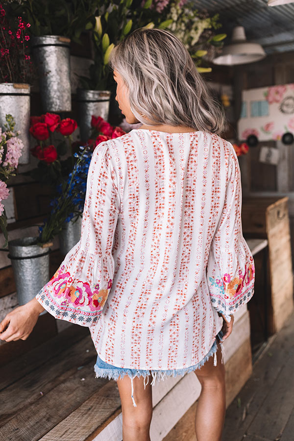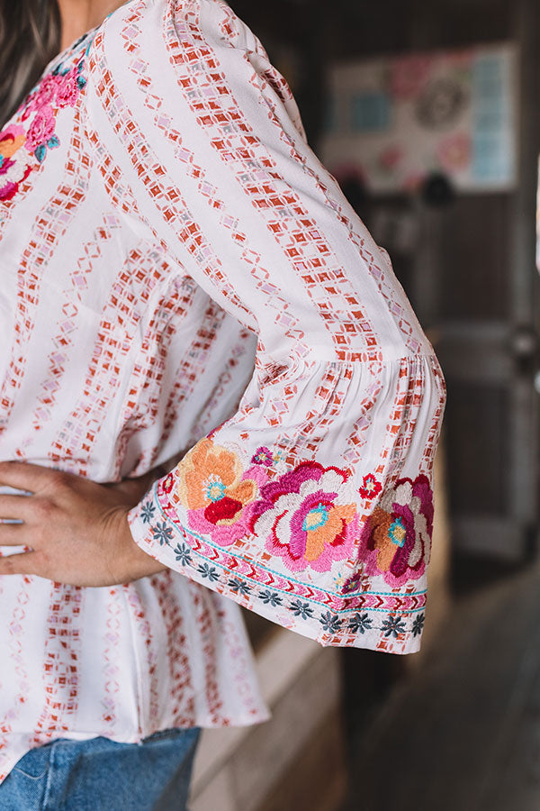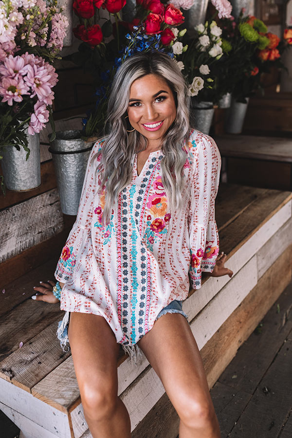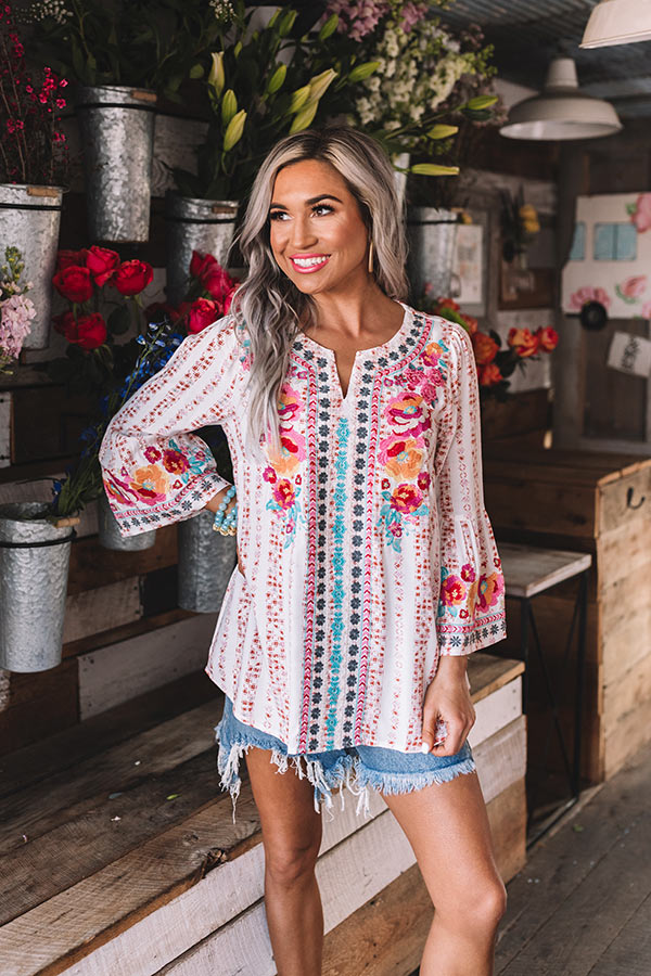 It will be easy to admire your amazing style when you arrive in this adorable white top featuring lightweight flowy material with an intricate stripe pattern and colorful embroidered floral detailing, a scooped neckline with a v-notch accent, loose 3/4-length sleeves with subtle flared cuffs, and a relaxed silhouette that falls into a rounded hemline! Measurements