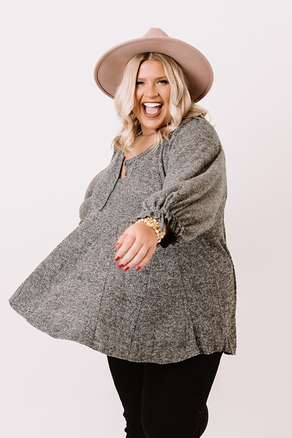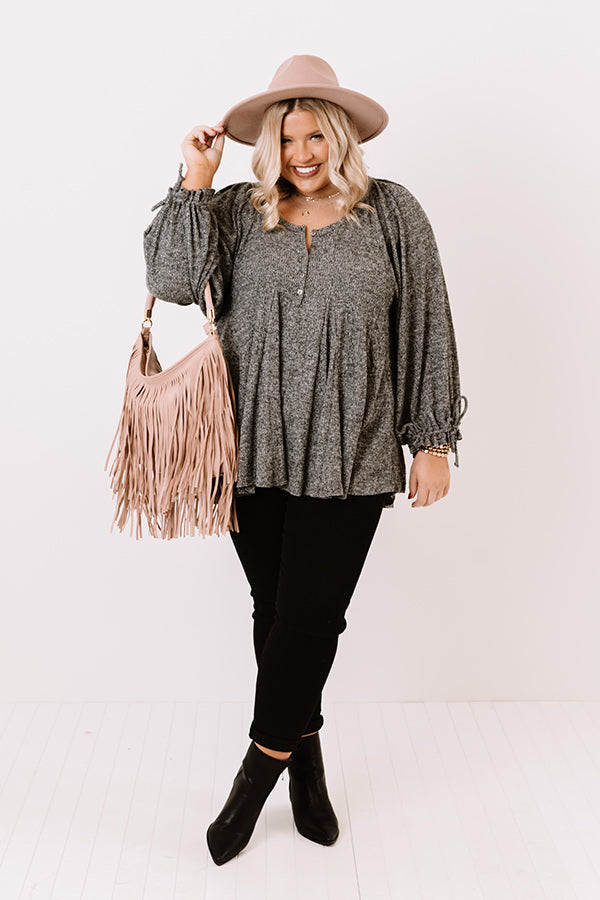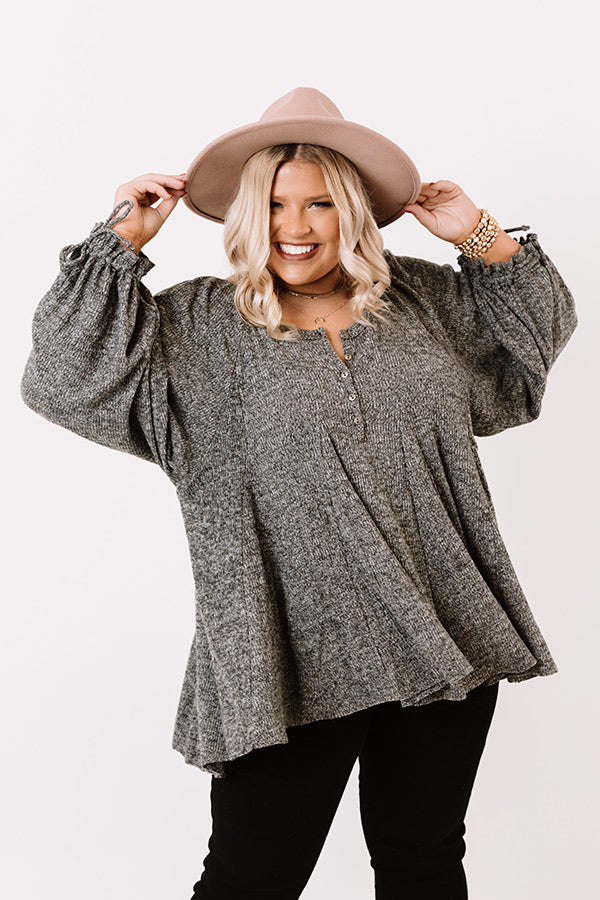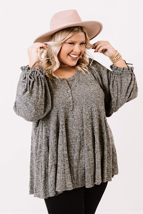 Plus Size - Add an effortless accent to your OOTD when you complete your look with this darling charcoal colored shift tunic featuring lightweight flowy material with subtle ribbed texturing, a button up bodice with a scooped neckline, long bishop sleeves with tie closure cuffs, and an ultra relaxed silhouette that cascades into an uneven upper-thigh length hemline! Measurements