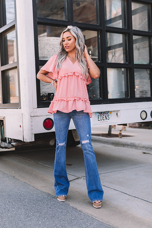 Keep your OOTD effortless in this adorable blooming dahlia colored top featuring lightweight breezy material, a deep v-cut neckline, draped short sleeves, oversized ruffled accent seams, and a relaxed silhouette that falls into an uneven hemline! You can style this cutie a variety of ways, like with some light wash flares and a brown mule heel, a snake print clutch, and a faux suede hat, but you can also wear it with some frayed white shorts and our "Five Star Clear Strap Wedge!" Measurements