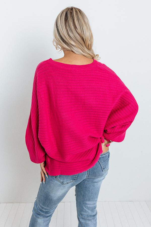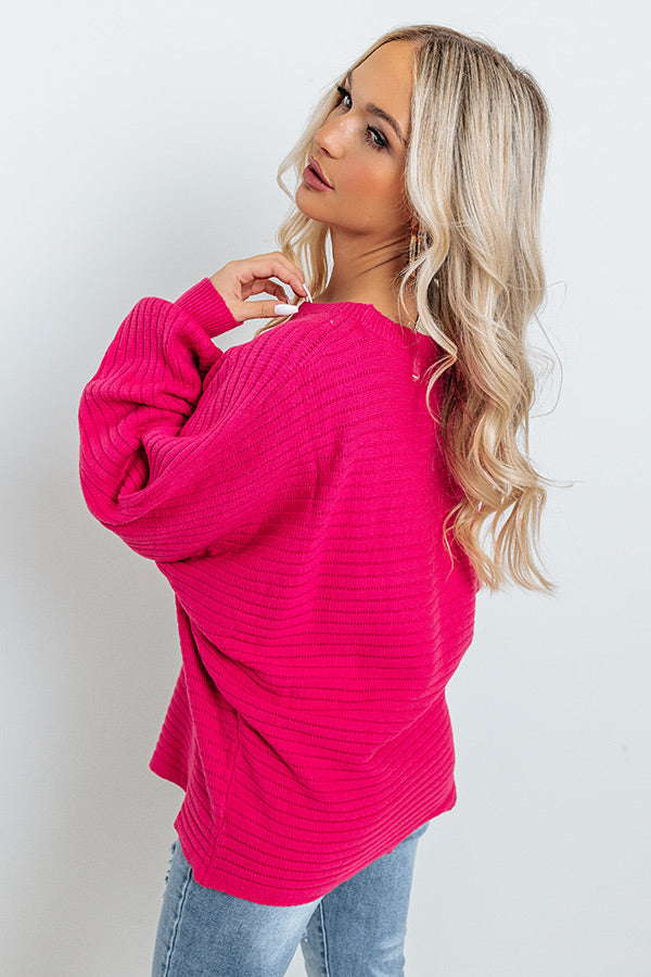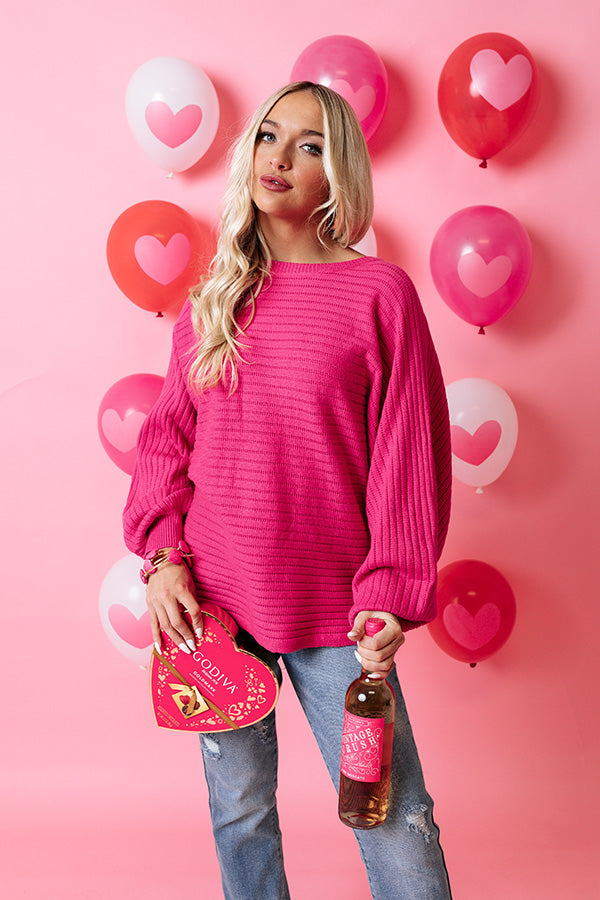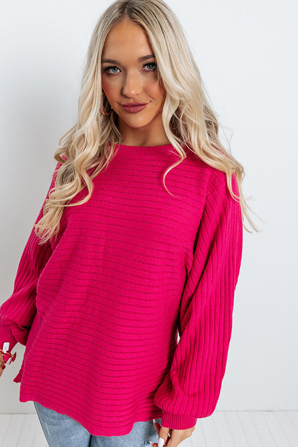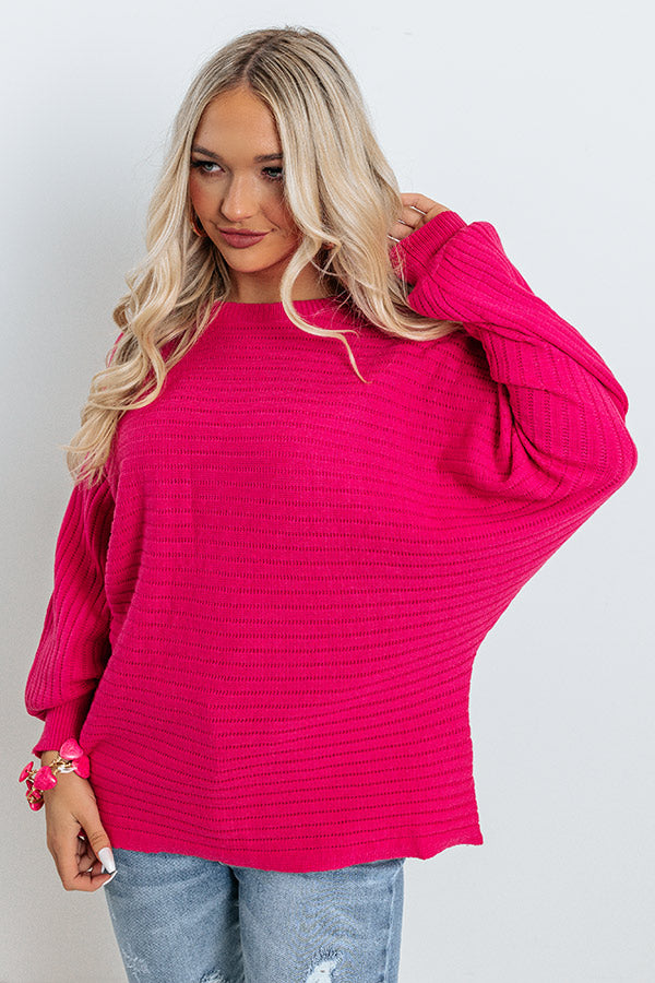 This pink shift sweater is as effortless as they come with its soft material, vertical ribbed texturing, a rounded neckline, long loose batwing sleeves with fitted cuffs, and a slouched silhouette that falls into a straight hemline!