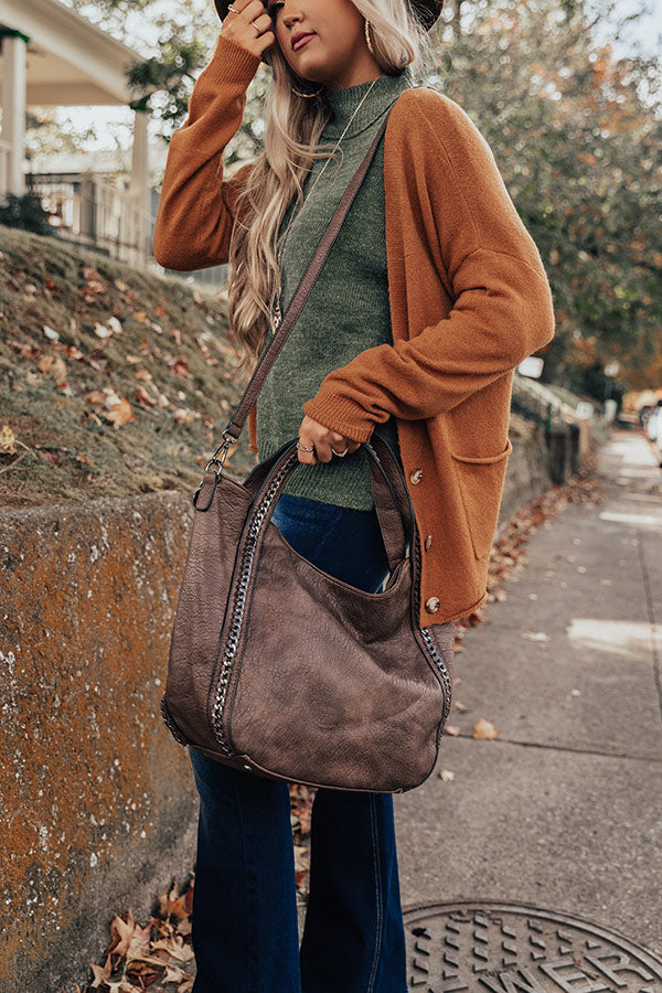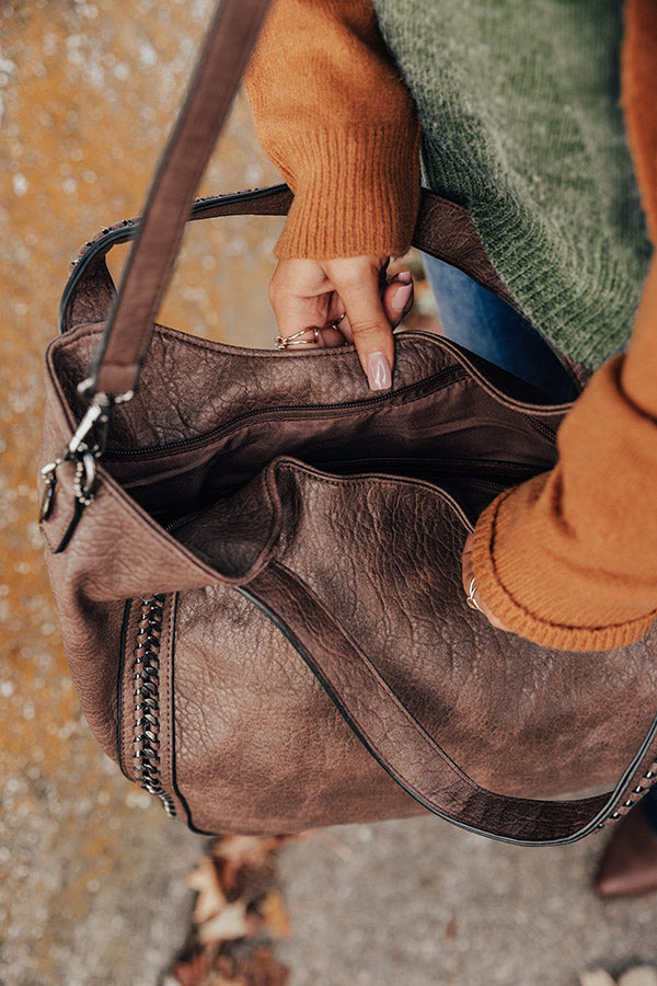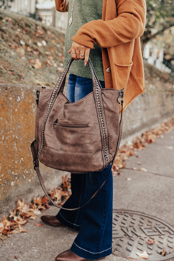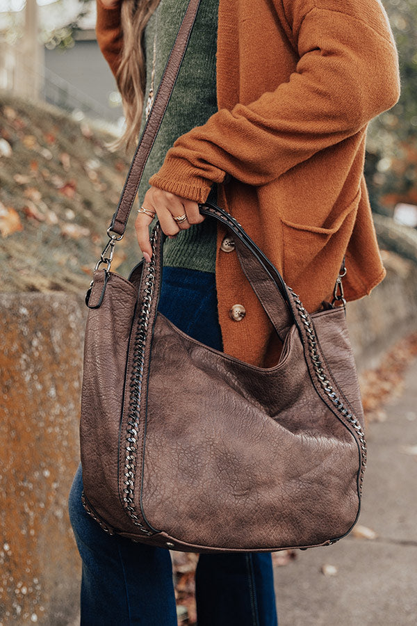 Effortlessly upgrade your OOTD with this gorgeous dark mocha colored tote featuring lightweight material with chain link accents, two tote handles, an extra outside pocket, an adjustable and removable shoulder strap, and a spacious fully lined pouch with a zip closure and additional inside pockets!
