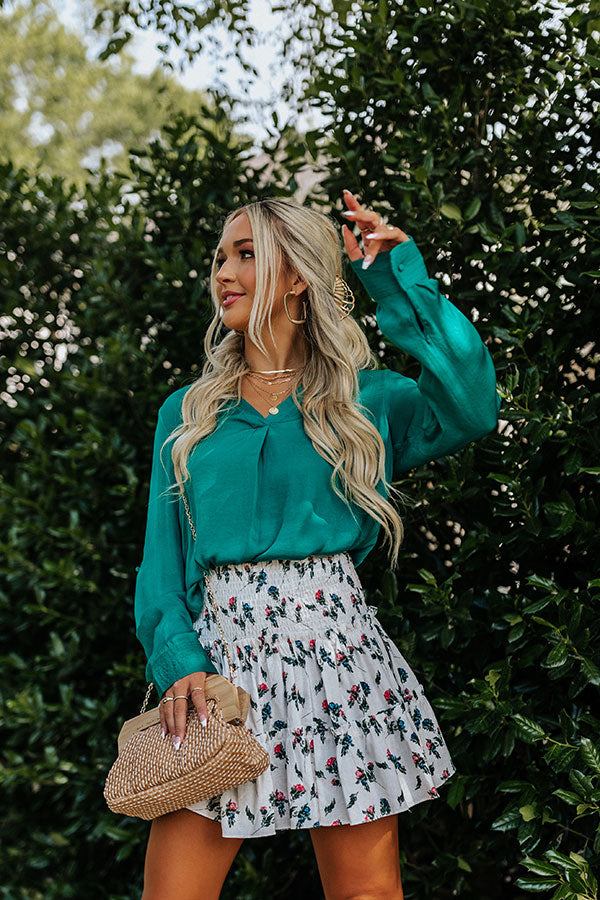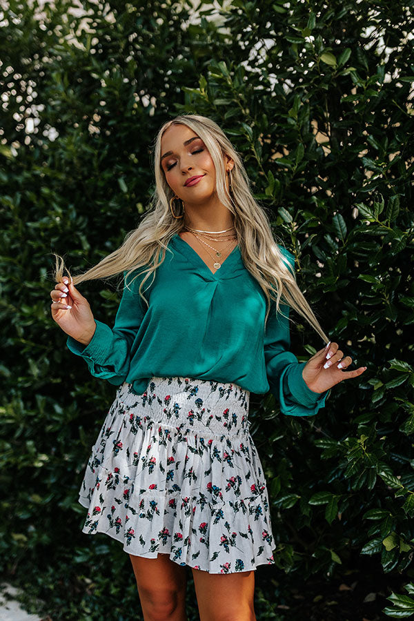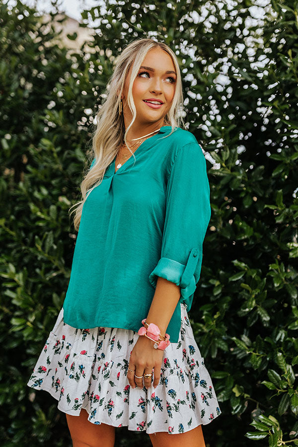 Your OOTD will be an effortless success when you complete your look with this cute green shift top featuring lightweight satin material, a v-cut neckline, long loose sleeves with button closure cuffs, and a relaxed silhouette that falls into a rounded hemline! Measurements