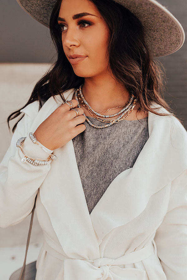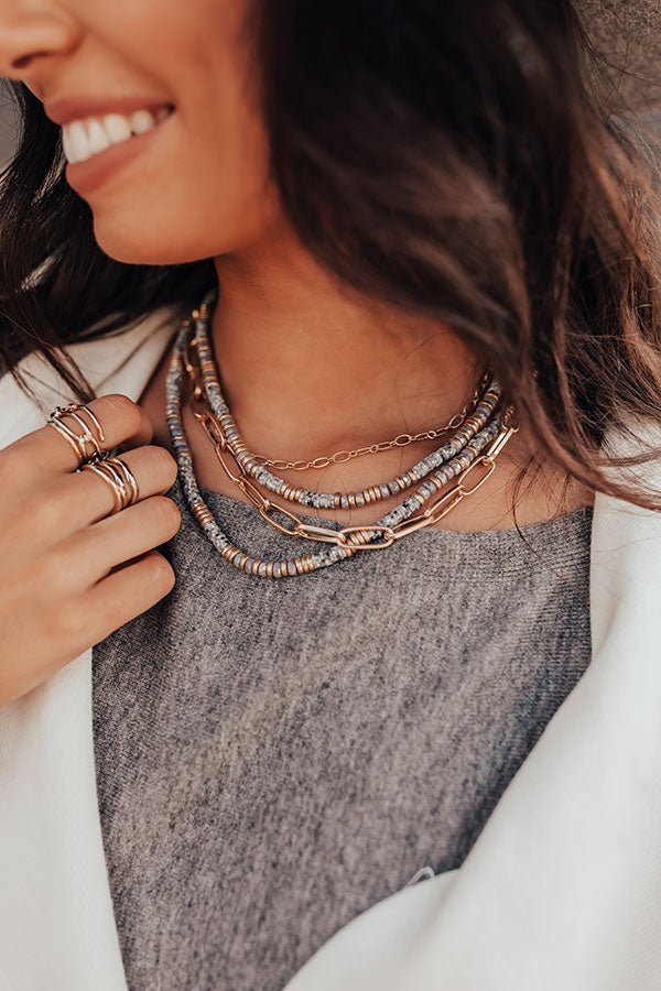 Leave a little sparkle wherever you go by accessorizing with our stunning 'Eiffel Tower' necklace featuring four layered chains adorned with dark grey and rose gold pieces!