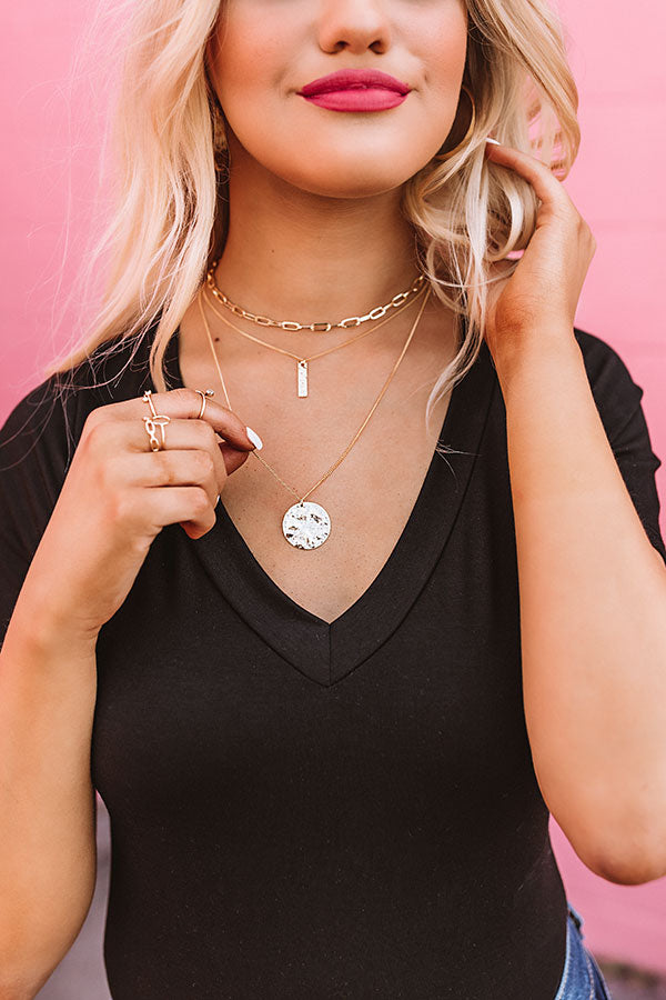 Add a little shine to your OOTD with our gold "Eiffel Tower Tour" necklace featuring three layered pieces with an oversized chain link choker and two longer snake charms with a rectangle and large gold circle charm!