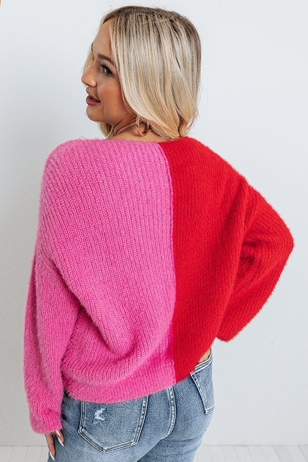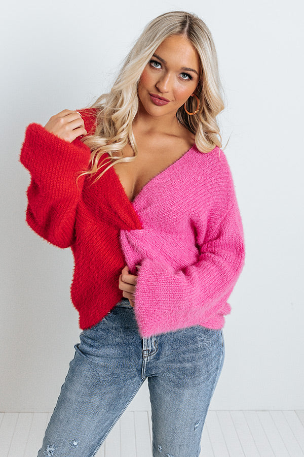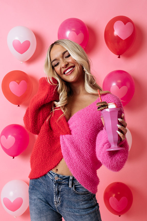 Make a fun statement this Valentine's Day with our adorable 'Electric Love' sweater featuring ultra soft hot pink and red material with a twist detail in the front, a v-cut neckline, long loose sleeves, and a relaxed silhouette that ends in a flirty tulip hemline!