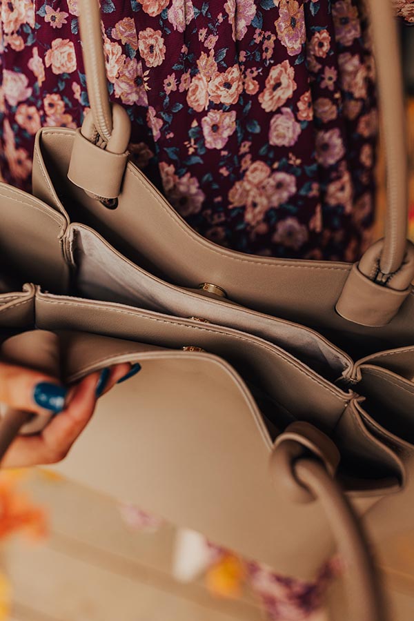 - A fully lined spacious interior with three separate pouches with button closures