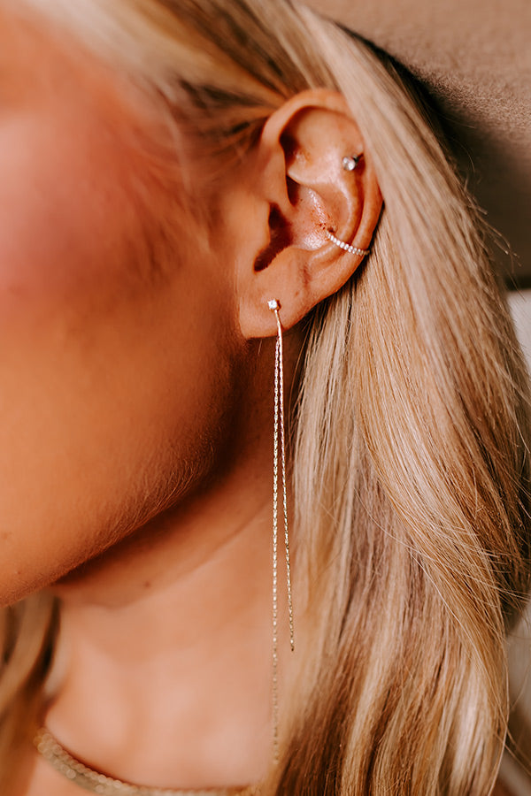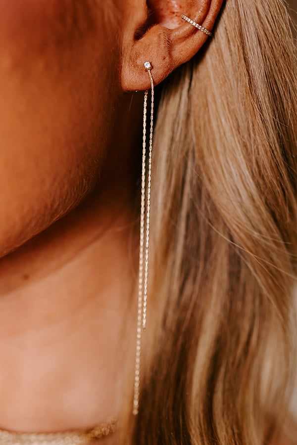 - A petite rhinestone stud with a chain drop design and a dangling chain drop on the backs as well