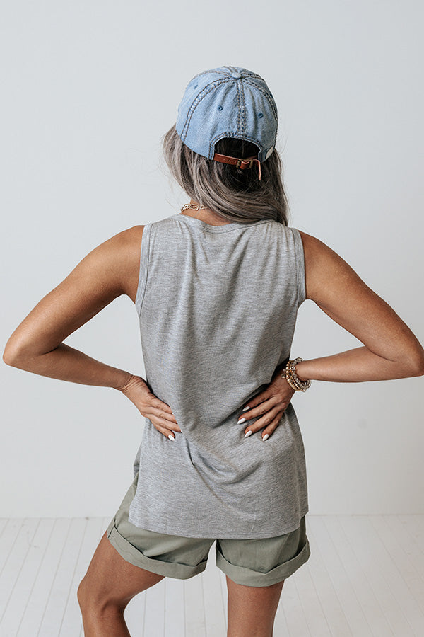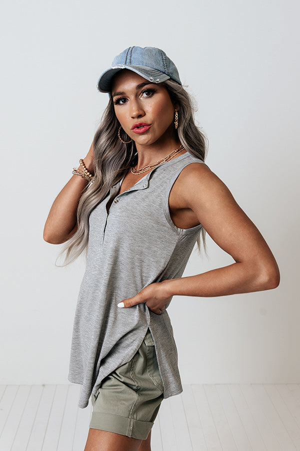 We encourage you to add this simple but sophisticated grey shift top to your cart with its soft lightweight material, a button up front with a rounded neckline, wide sleeveless shoulder straps, and a relaxed silhouette that ends in a straight hemline!