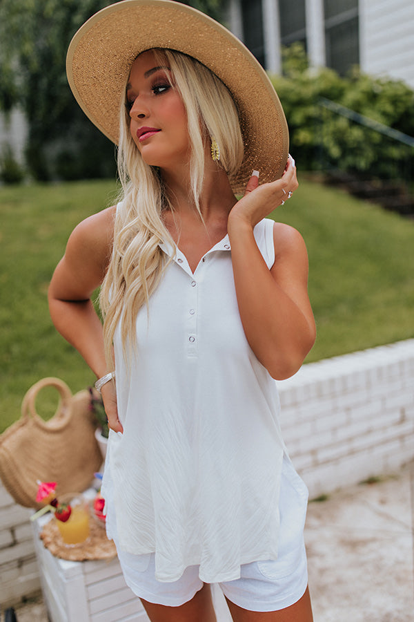 We encourage you to add this simple but sophisticated ivory shift top to your cart with its soft lightweight material, a button up front with a rounded neckline, wide sleeveless shoulder straps, and a relaxed silhouette that ends in a straight hemline!